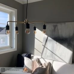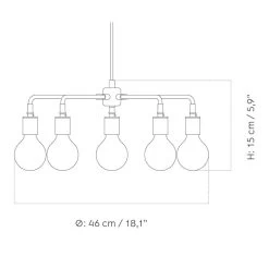 Das Gestell besteht aus massivem, matt poliertem Messing. Das Textilkabel und die Fassungen sind in klassischem Schwarz gehalten, was einen schönen Farbkontrast zu dem edlen Messing darstellt. Die fünf E27-Lichtquellen sind von allen Seiten gut sichtbar, da hier auf einen Leuchtenschirm verzichtet wurde. Dekorative Leuchtmittel, wie Filament- oder Rustikalampen, sind daher hier besonders empfehlenswert. Auf Wunsch kann ein stimmungsvolles Ambiente geschaffen werden, indem man die Helligkeit über einen externen Dimmer anpasst.