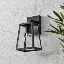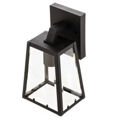 An die Fassade rustikal gestalteter Bauten passt die Außenwandleuchte Matslot ebenso wie an die Wand eines Landhauses oder eines modernen Gebäudes, denn sie wurde sehr geradlinig aus matt-schwarzem Metall und klarem Glas gefertigt. Eckig geformt wurde sowohl die Wandhalterung als auch der Schirm, der nach unten ein wenig weiter wird und mit klaren Glasscheiben mit schönem Facettenschliff am Rand bestückt ist. Er hängt an einem kleinen Ausleger nach unten gerichtet an der Wandhalterung.