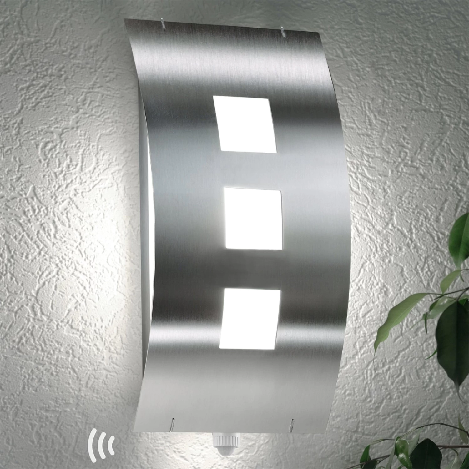 Dekorativ und hochwertig präsentiert sich diese Außenwandleuchte aus rostfreiem Edelstahl. Drei quadratische Ausschnitte mit hinterlegtem Acrylglas lockern die fein gebürstete, leicht gebogene Edelstahlfront auf und lassen einen Teil des Lichts weich und blendfrei direkt nach vorne austreten. Sehr effektvoll wirkt außerdem die indirekte, seitlich und nach unten gerichtete Lichtabgabe.