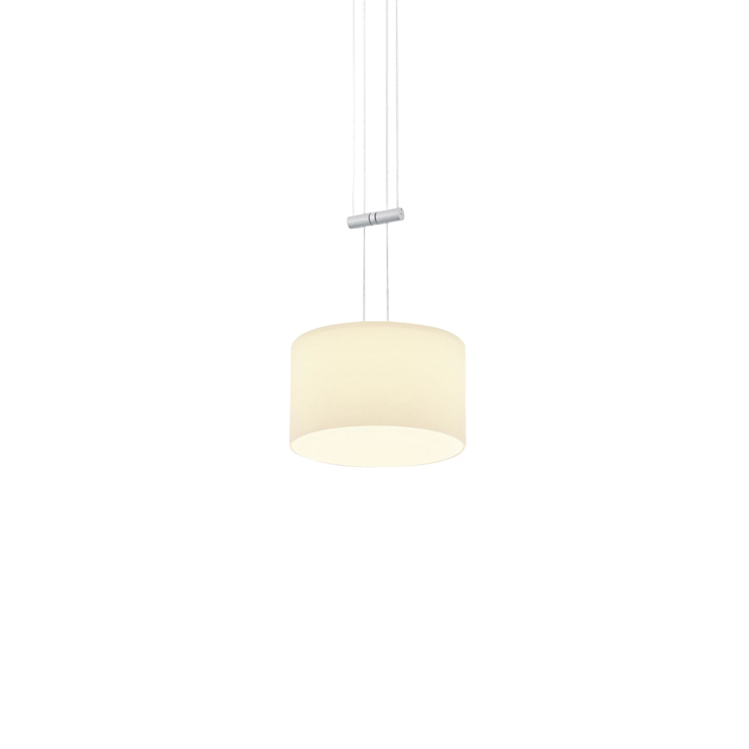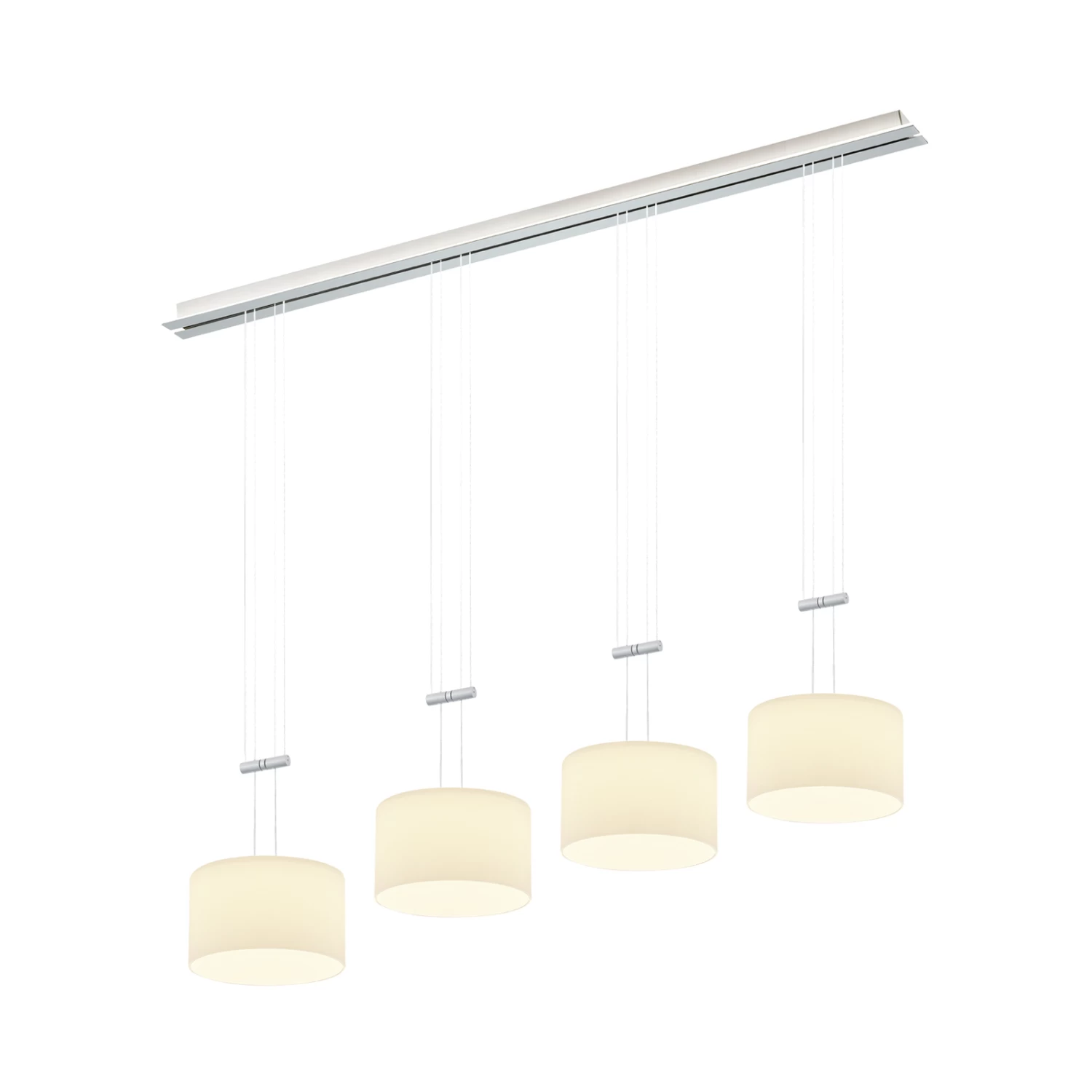 Aus einer beleuchteten Schiene und vier Pendelleuchten setzt sich die LED-Hängeleuchte Strada Grand Opal in dieser Ausführung zusammen. Hergestellt wurde die Schiene aus eloxiertem Aluminium. Die Schirme bestehen aus opalweißem Glas und können im Rahmen der Montage horizontal ausgerichtet werden. Auch die Abhängung ist bei jedem Pendel separat einstellbar.