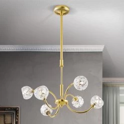 Diamantschliff, 24 karätige Vergoldung und praktische Höhenverstellbarkeit – diese Eigenschaften machen die in Österreich gefertigte Hängeleuchte Maderno zu einem Lichtspender der besonderen Art. Schwungvoll erstrecken sich die Leuchtenarme – teils nach oben und teils nach unten gebogen – in die Umgebung der Hängeleuchte. Die unterschiedliche Platzierung der hochwertigen Glasschirme bewirkt eine umfassende Verteilung des Lichts in den Raum. Bemerkenswert ist das effektvolle Rautenmuster, das mithilfe eines besonderen Diamantschliff-Verfahrens in die Leuchtengläser eingearbeitet wurde. Bei eingeschaltetem Licht wird das Schliffmuster, das sich durch die Transparenz optisch vom ansonsten satiniert gehaltenen Glas absetzt, optimal in Szene gesetzt. Der Teleskoparm erlaubt eine Höhenverstellung der Leuchte im Betrieb zwischen 62 und 83 cm, wodurch sich Maderno unterschiedlichen Situationen variabel anpassen lässt.