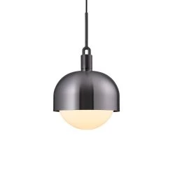 Diese Pendelleuchte des englischen Labels Buster + Punch wurde aus Stahl gefertigt, der zum Teil in Handarbeit veredelt wurde und ist mit einem doppelt gearbeiteten Schirm ausgestattet. In dem Stahlschirm sitzt eine mundgeblasene Kugel aus Opalglas, die für eine gleichmäßige, blendfreie und gestreute Lichtwirkung verantwortlich ist. Wie alle Leuchten von Buster + Punch trägt auch diese Hängeleuchte das besondere Merkmal des Labels – das Rändelmuster mit Schriftzug an der Fassung. Nicht nur Tische oder Theken im privaten Bereich lassen sich mit der Hängeleuchte Forked sehr angenehm beleuchten, auch in der Gastronomie oder Hotellerie lässt sie sich hervorragend einsetzen.