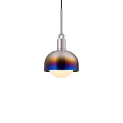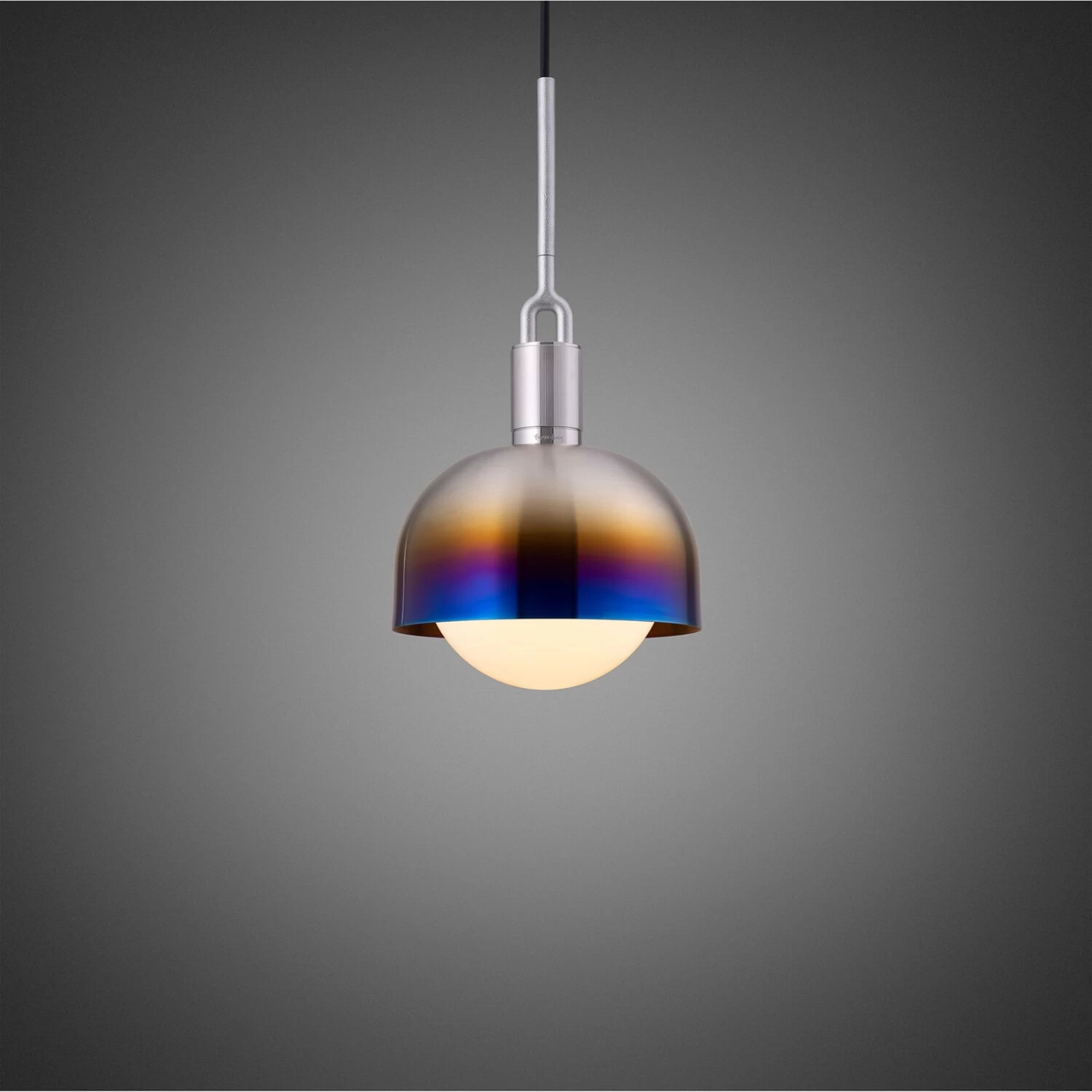 Diese Pendelleuchte des englischen Labels Buster + Punch wurde aus Stahl gefertigt, der zum Teil in Handarbeit veredelt wurde und ist mit einem doppelt gearbeiteten Schirm ausgestattet. In dem Stahlschirm sitzt eine mundgeblasene Kugel aus Opalglas, die für eine gleichmäßige, blendfreie und gestreute Lichtwirkung verantwortlich ist. Wie alle Leuchten von Buster + Punch trägt auch diese Hängeleuchte das besondere Merkmal des Labels – das Rändelmuster mit Schriftzug an der Fassung. Nicht nur Tische oder Theken im privaten Bereich lassen sich mit der Hängeleuchte Forked sehr angenehm beleuchten, auch in der Gastronomie oder Hotellerie lässt sie sich hervorragend einsetzen.