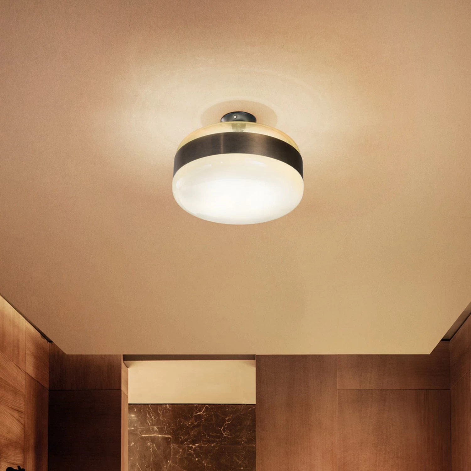 Der komplett geschlossene Glasschirm der Deckenleuchte Futura ist nach unten opalisiert, so dass das Licht nicht blendet, und nach oben in einem zarten Amberton gefärbt, jedoch transparent, so dass das Licht nach allen Seiten entweichen kann. Die Zweiteilung des Glasschirms in Opal und Transparent wird durch das Metallband in Bronze optisch unterstützt. Jedoch bleibt diese Zweiteilung eine optische, denn grundsätzlich ist der Schirm aus einem Stück gefertigt. Eine spezielle Glasblastechnik macht dies möglich. Die Deckenleuchte Futura stammt nämlich aus einer der traditionsreichsten Glasbläserhütten auf der Insel Murano nahe Venedig.