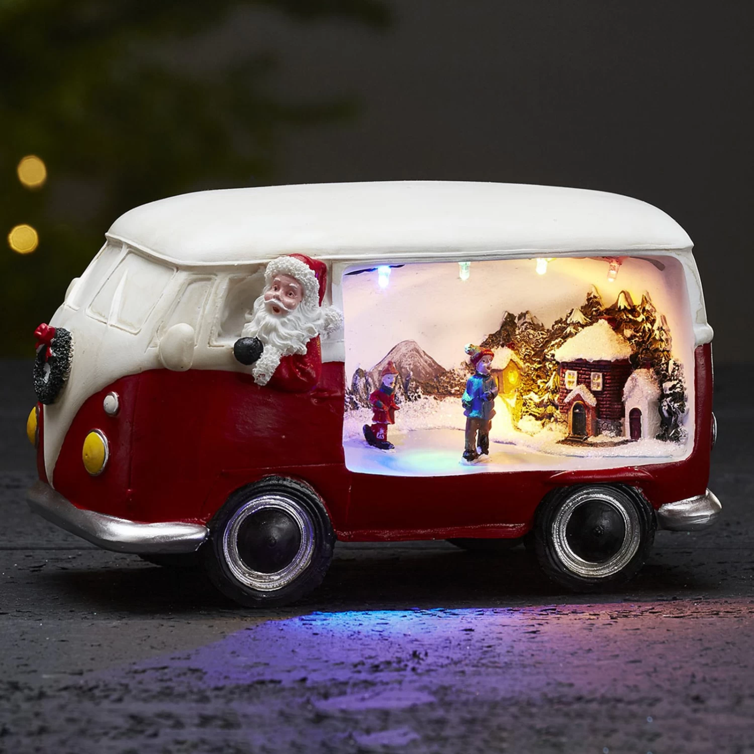 Die LED-Dekoleuchte Merryville stellt den Weihnachtsmann in einem ganz besonderen Gefährt dar: dem legendären Bully-Bus. Hinten ist noch eine Schlittschuhläufer-Szene abgebildet, die durch das LED-Licht perfekt illuminiert wird.