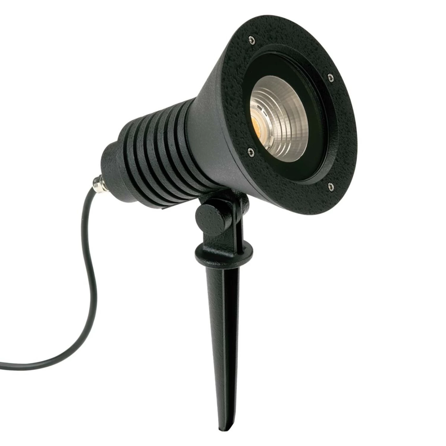 Mit dieser sehr robust gearbeiteten und dank Schutzart IP54 auch stärkeren Witterungseinflüssen trotzenden LED-Erdspießleuchte aus Aluminiumguss mit Reflektor aus eloxiertem Reinstaluminium lassen sich Gebäude oder auch bevorzugte Bereiche auf dem Grundstück ins rechte Licht setzen. Der Erdspießstrahler wird mit einem 250 cm langen Kabel mit Stecker geliefert, die Platzierung auf dem Grundstück ist denkbar einfach. Ein Erdspieß ist bereits integriert, so dass Demond einfach nur ins Erdreich gesteckt werden muss. Der Leuchtenkopf ist drehbar (360°) und schwenkbar (120°), wodurch sich die Lichtausrichtung sehr flexibel gestaltet.