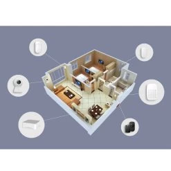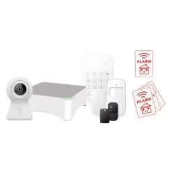 – Lieferumfang: 1 x Alarmzentrale, 1 x Indoor IP-Kamera, 1 x drahtloser PIR-Sensor, 1 x drahtloser Türsensor, 1 x Fernbedienung, 1 x passive RFID-Etiketten, 3 x Einbruchschutz-Aufkleber, 1 x Einbruchschutz-Warnschild