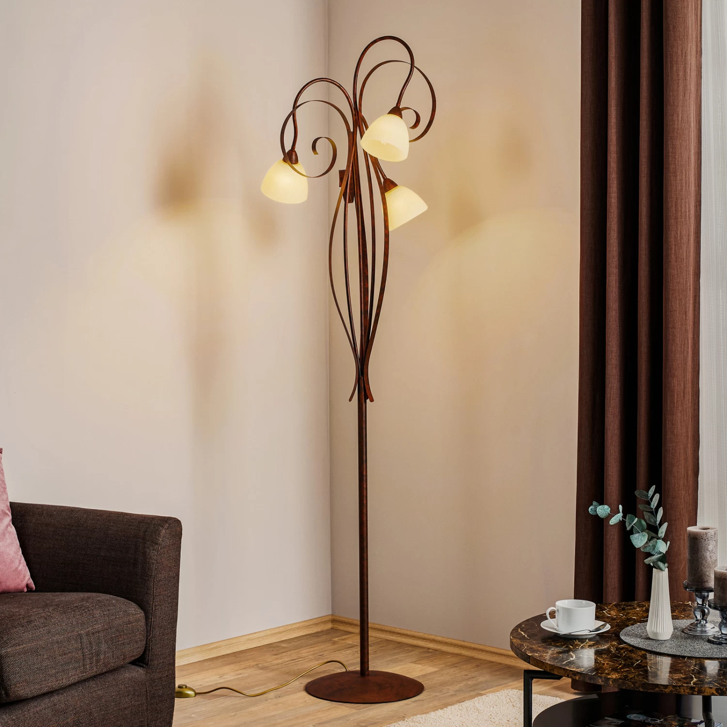 Diese Leuchte erinnert mit ihrem Design an den Landhausstil. Mit geschwungenen Leuchtarmen in Rostoptik wirkt die Leuchte rustikal und lebendig. Die satinierten, cremefarbenen Glasschirme harmonieren hervorragend mit der rustikalen Rostoptik. Die Lichtwirkung der italienischen Leuchte ist angenehm und wohltuend.