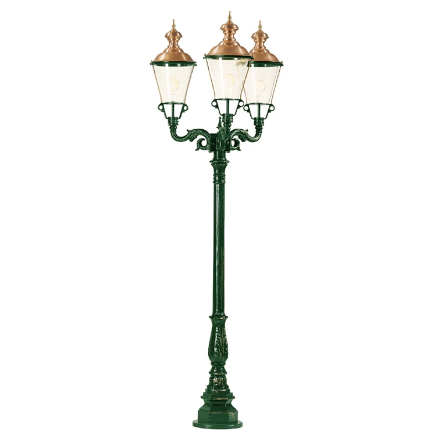 Dieser Kandelaber überzeugt mit seiner stattlichen Höhe, der dreiflammigen Ausführung und klassischer Bauart mit ansprechenden, spitzen Kupfer-Hauben. Dabei trägt diese hochwertige Leuchte nicht nur zu einem repräsentativen Erscheinungsbild von zahlreichen Gartenbereichen bei, sondern erhellt diese auch mit großer Wirkung. Vor allem das klassische Design ist immer wieder schön anzusehen, bewirkt ein stimmungsvolles Ambiente und vermittelt vor allem Sicherheit durch angemessene Beleuchtung.