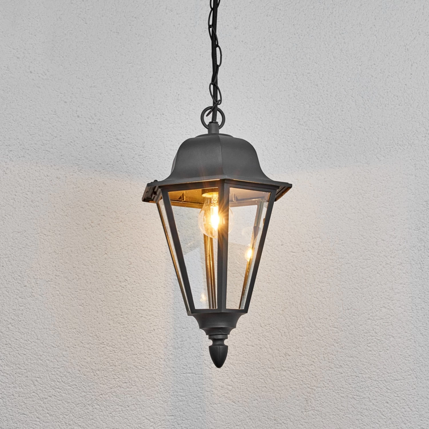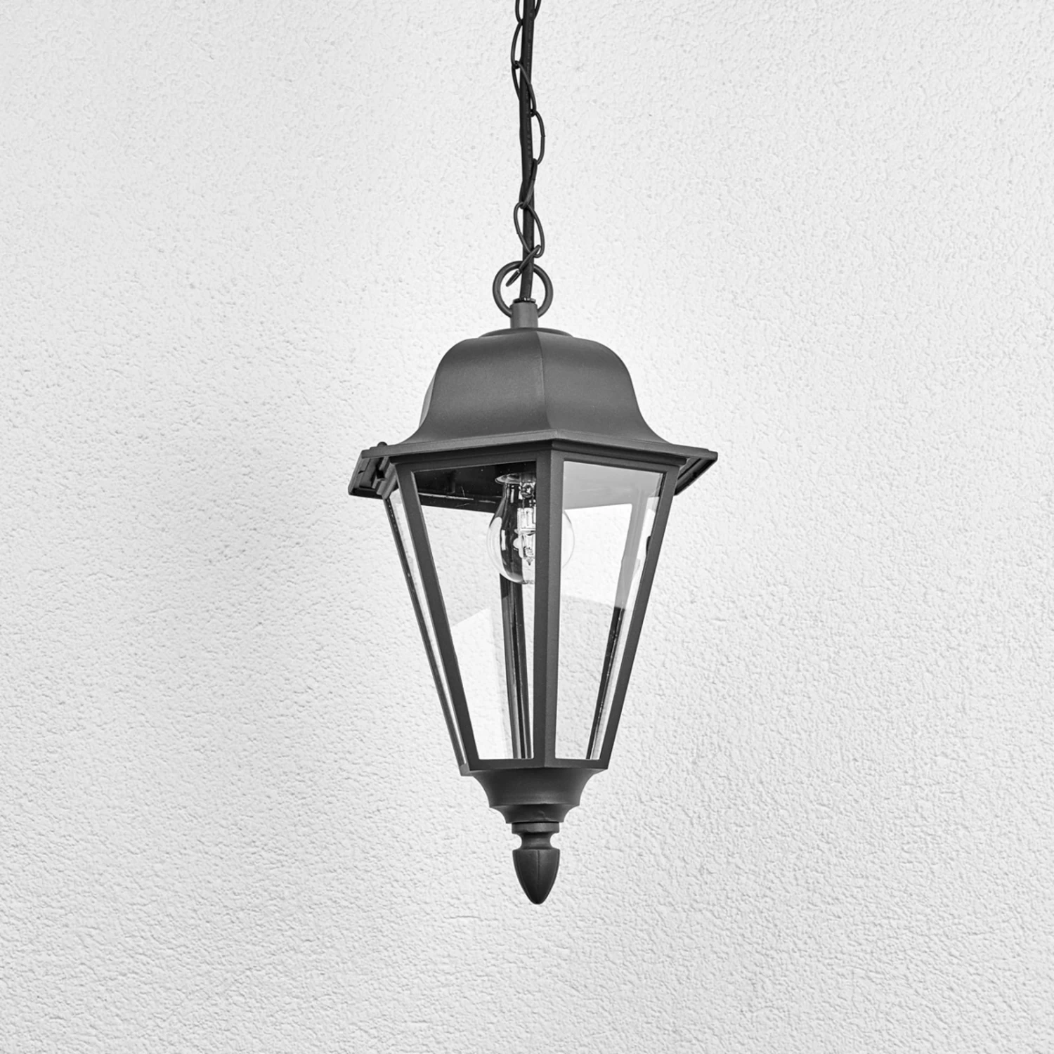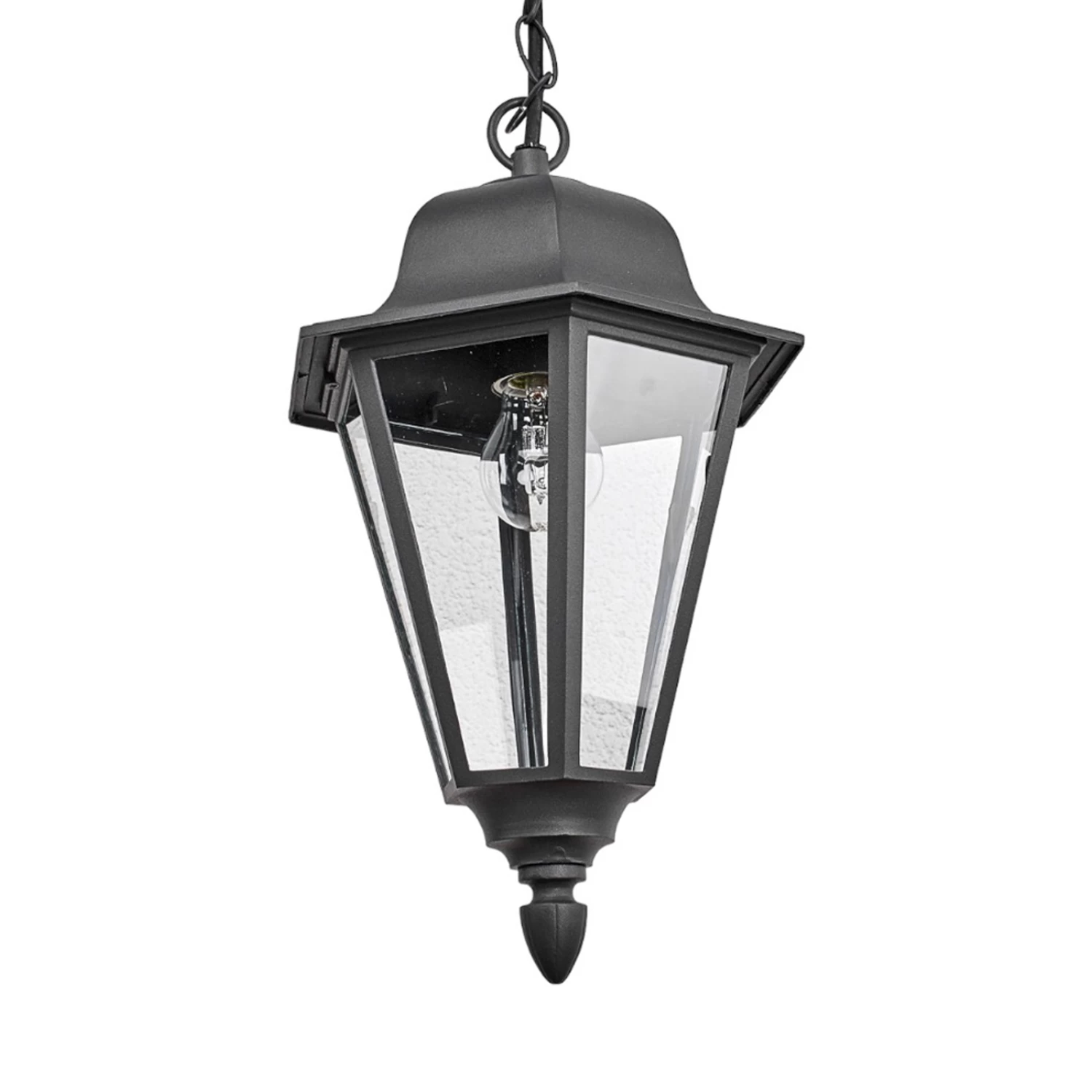 Edana erinnert einen beim Betrachten direkt an die Laternen, die man als die Hauptbeleuchtungsform aus vergangenen Jahrhunderten kennt. So ergibt sich beim Anblick der Hängelampe eine nostalgische Note, weshalb Edana auch sehr schön zu historischen Gebäuden zu passen scheint. Die Oberfläche ist in einem zeitlosen Grafitgrau gehalten und gedacht ist Edana als Hängelampe für außen, die mit E27-Lampen bestückt werden kann. So lassen sich hier nicht bloß die altbekannten Glüh- oder Halogenlampen nutzen, wer möchte kann auch auf LED-Lampen zurückgreifen, die nur wenig Energie verbrauchen und zum Teil schon so gebaut werden, dass sie einer Glühlampe täuschend ähnlich sehen.