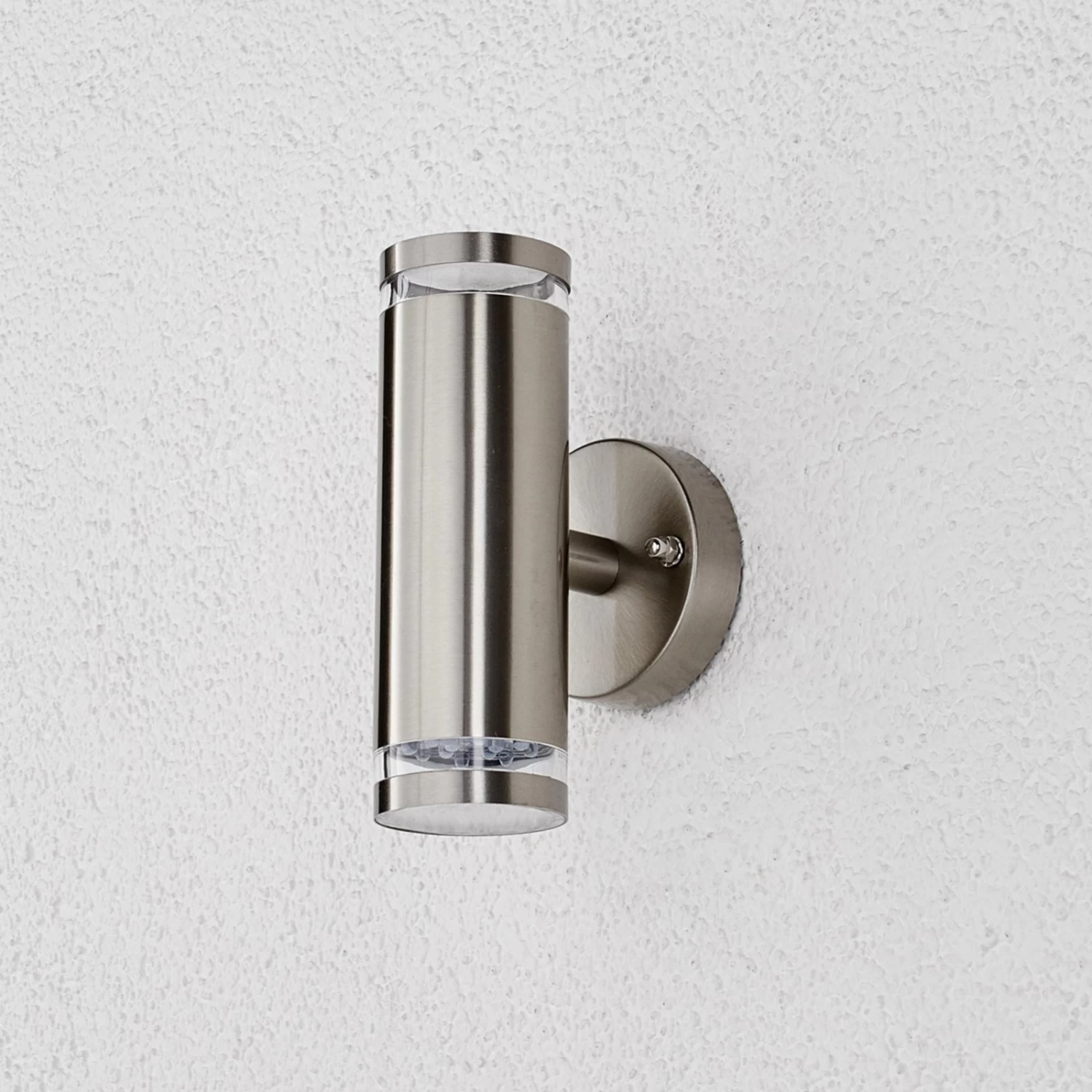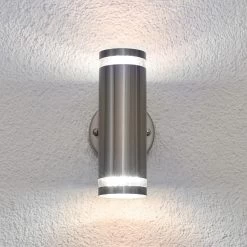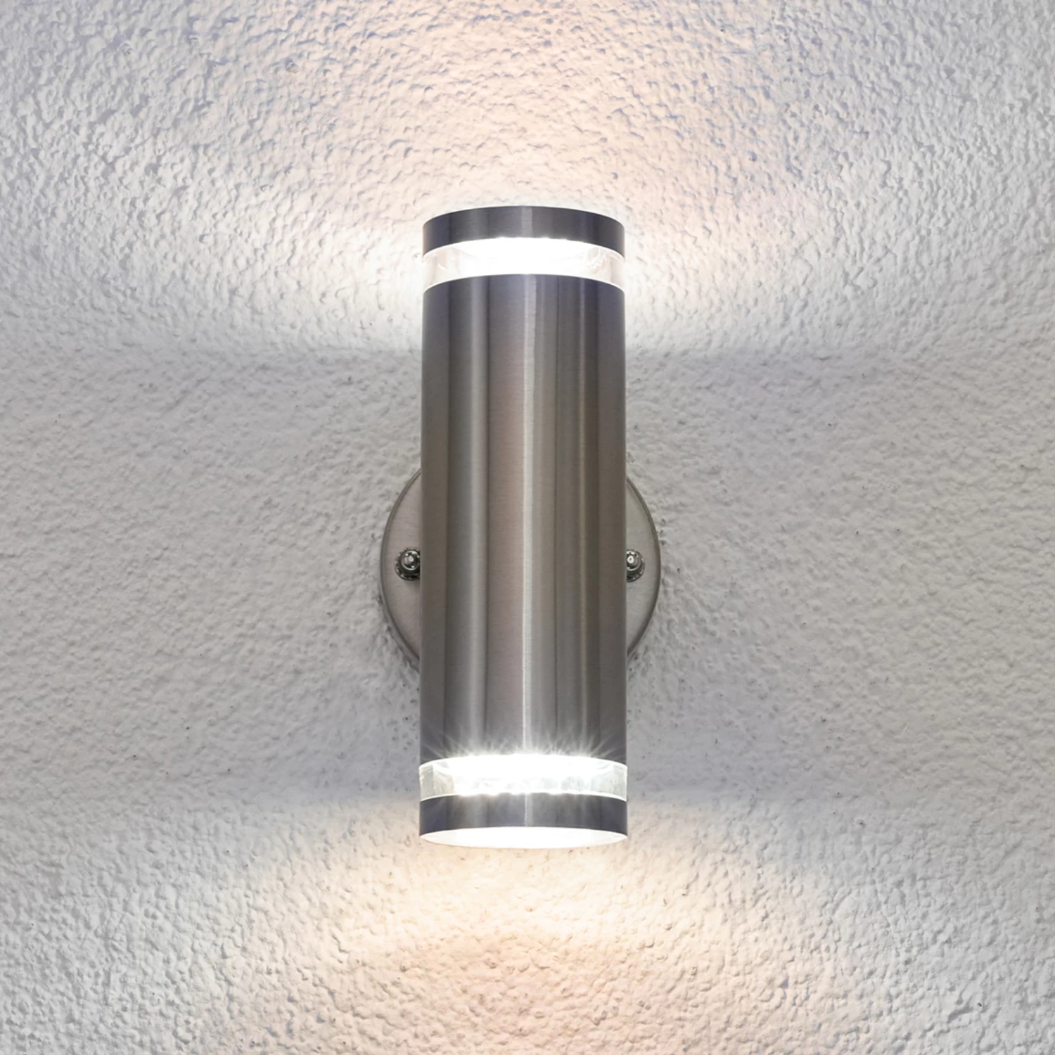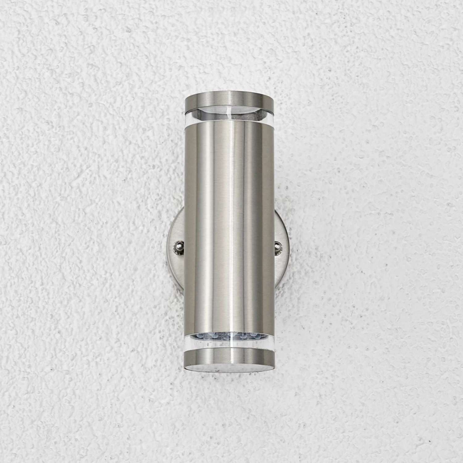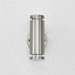 Diese aus Edelstahl gefertigte Außenwandleuchte erscheint modern und ist mit zeitgemäßer LED-Technik ausgestattet. Der Edelstahlschirm ist in Zylinderform gestaltet und der Lichtaustritt erfolgt sowohl nach oben als auch nach unten.