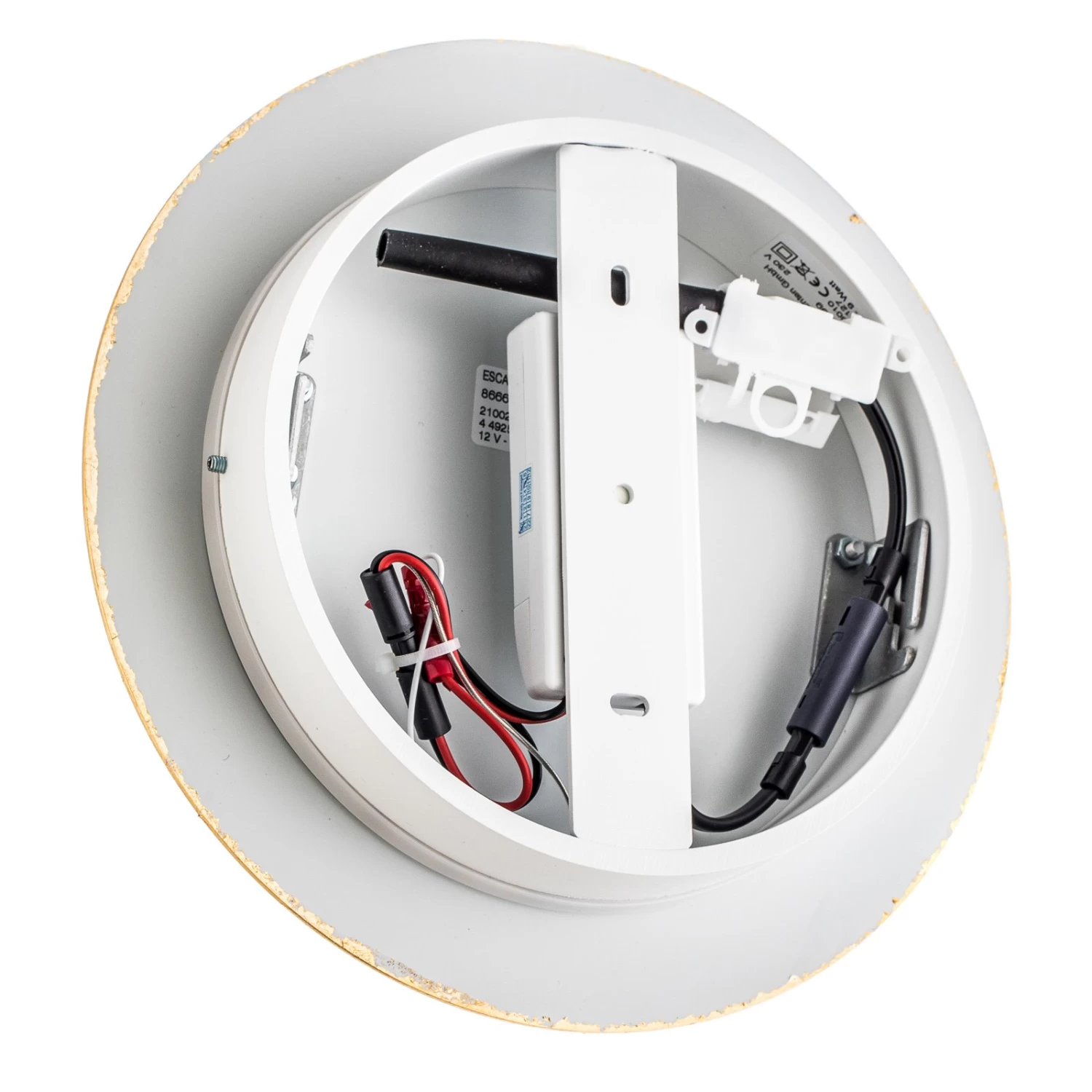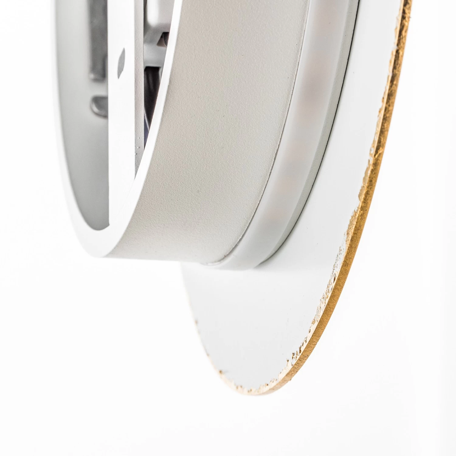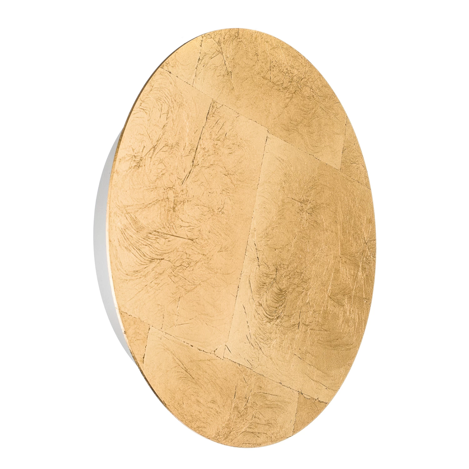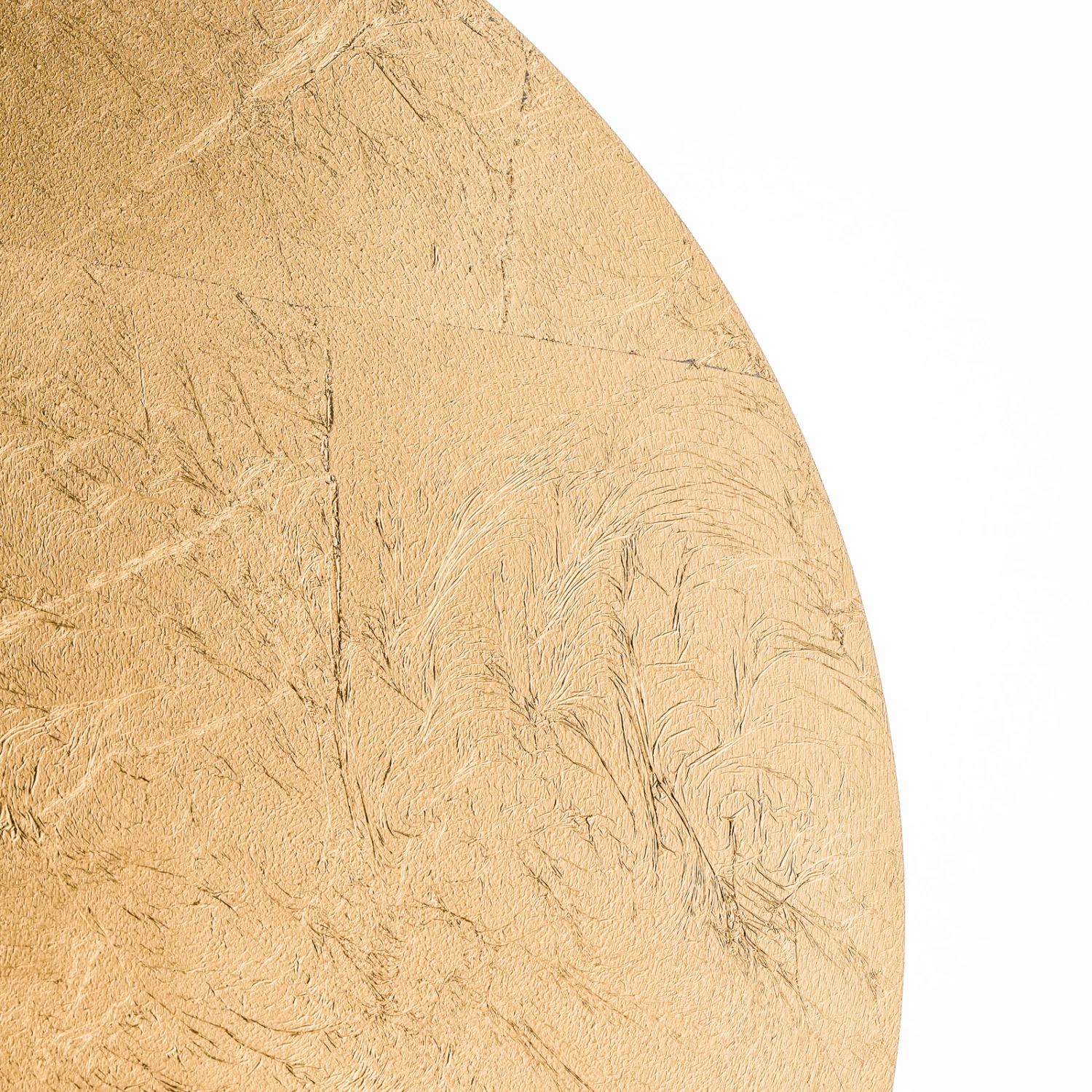 Die indirekt strahlende Wandleuchte Blade zeichnet sich durch eine angenehme Lichtwirkung und ein modernes wie wertiges Erscheinungsbild aus. Mit ihrem unregelmäßig strukturierten Blattgold-Finish zieht die Leuchte des Herstellers Escale sofort die Blicke auf sich. Die aus Aluminium gefertigte, kreisrunde Scheibe verdeckt die rückseitig gelegenen LEDs, sodass deren warmweißes Licht nur in Richtung der Wand abgegeben wird und dort einen diffusen Lichthof ringsum die Leuchte bewirkt.