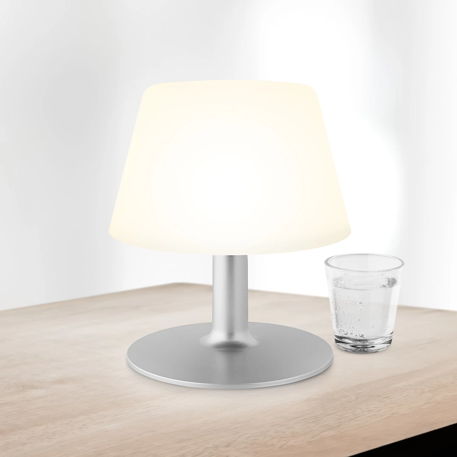 Aus einem Fuß aus silbern lackiertem Stahl und einem Schirm aus opalweißem Kunststoff setzt sich die LED-Solar-Tischleuchte SunLight zusammen. Sie ist sowohl staubdicht als auch gegen Strahlwasser geschützt und wird so zur dekorativen Lichtquelle auf der Terrasse oder dem Balkon. Da ein Solarpanel und Akkus integriert sind, lässt sie sich ohne zusätzliche Stromquelle nutzen.