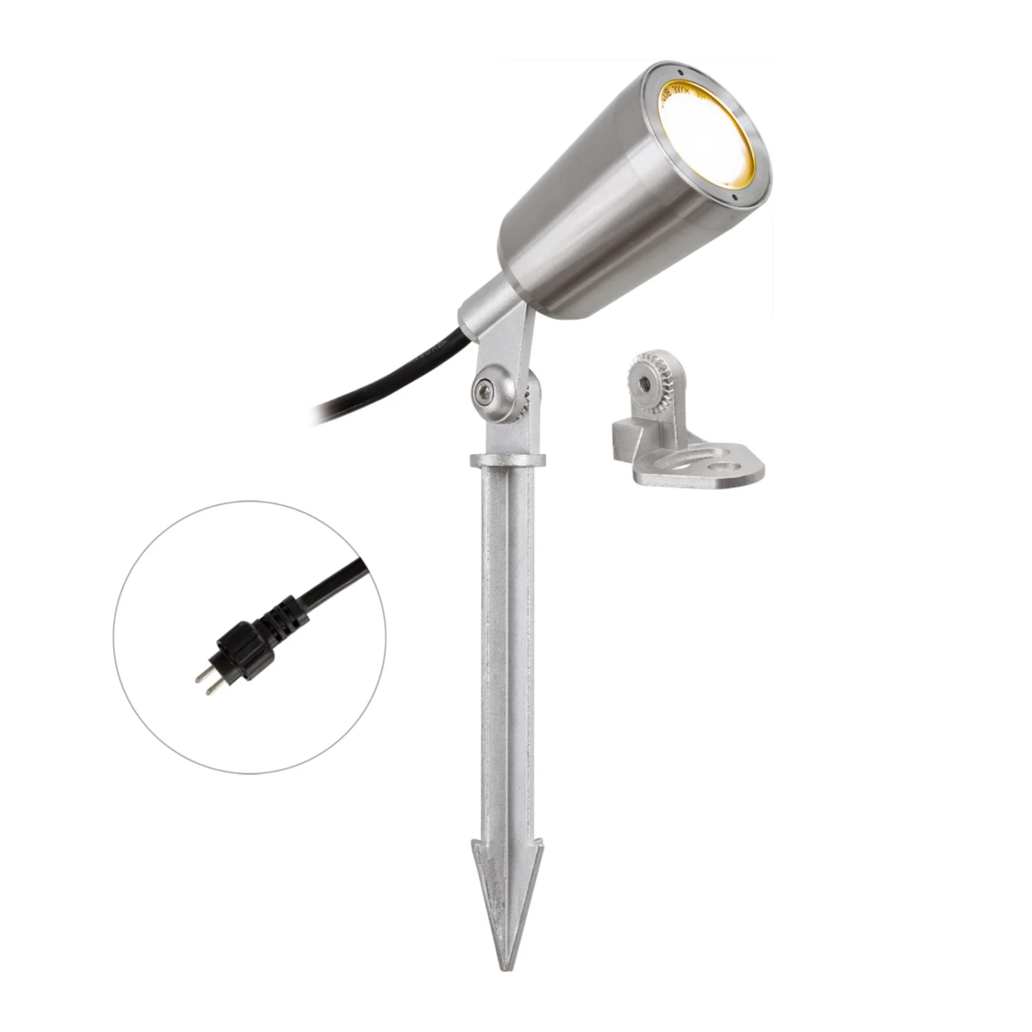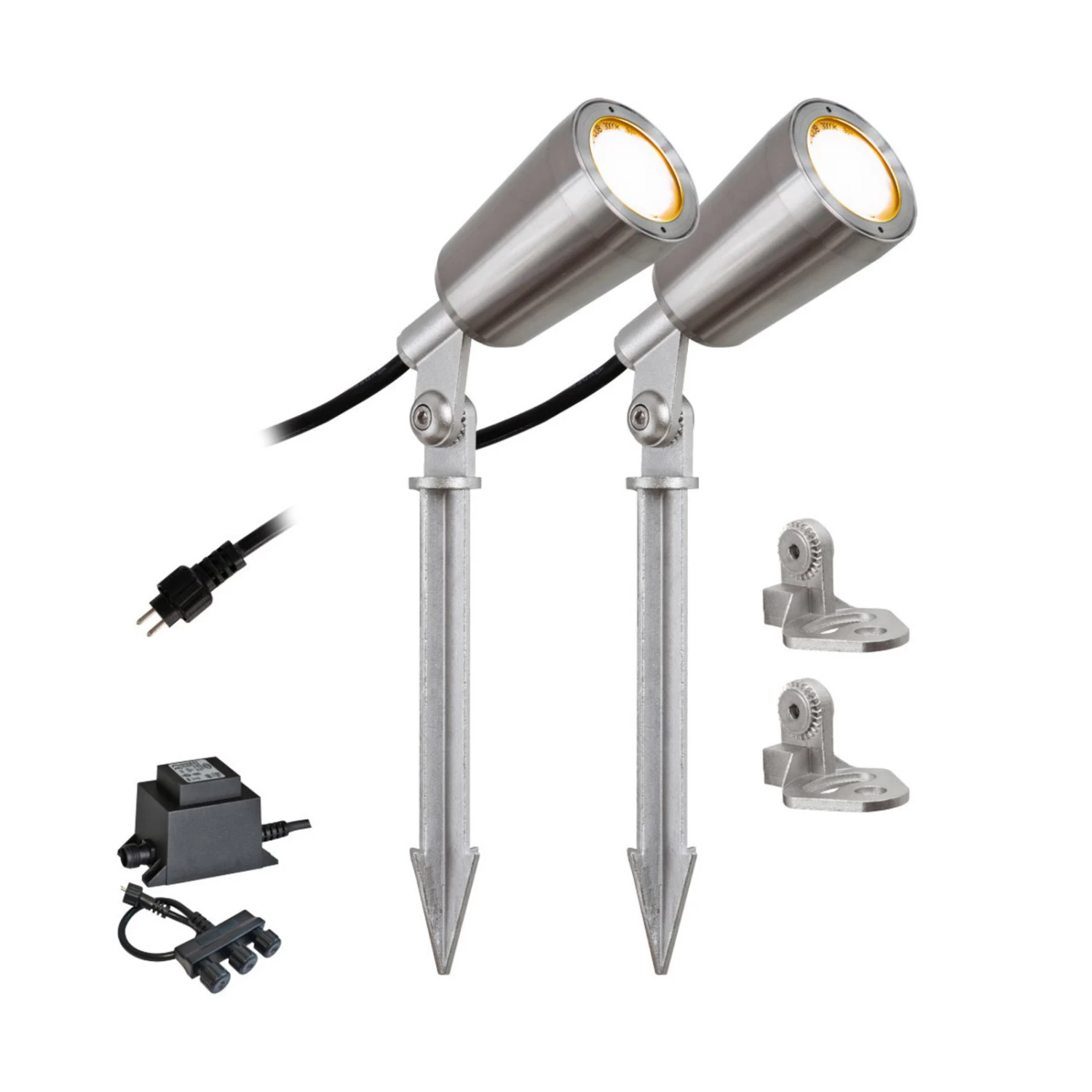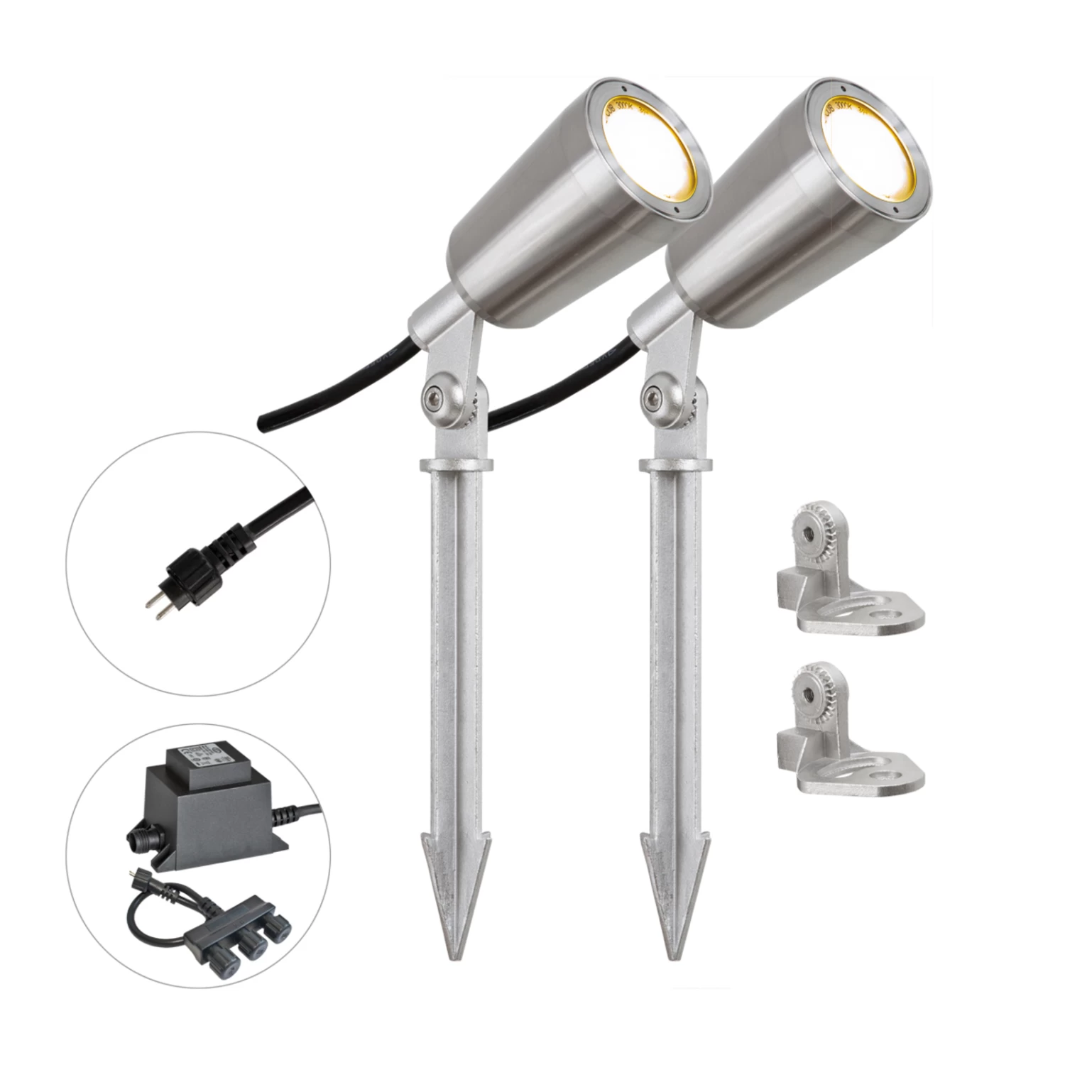 2er-Set mit Trafo und Verteiler: LED-Gartenspot PC6806 aus Edelstahl mit IP44-Stecksystem, schwenkbar