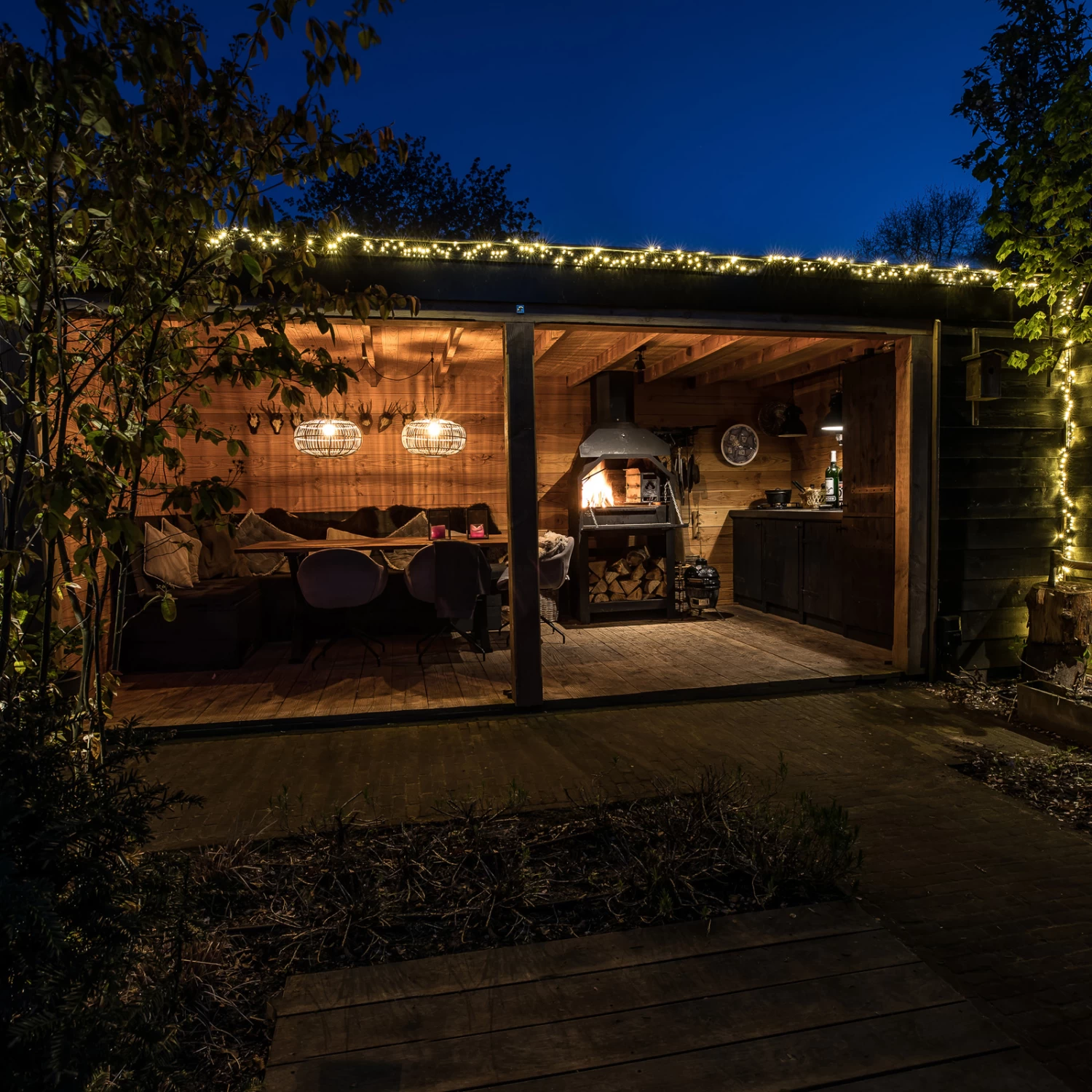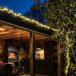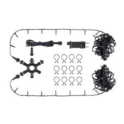 Lieferumfang: 2 x 5 m Lichterkette, 5 m Zuleitung, 1 Verteilerring mit 5 Ausgängen, 31V-Trafo (IP44) mit Dimmer und Timer, 12 Klammern