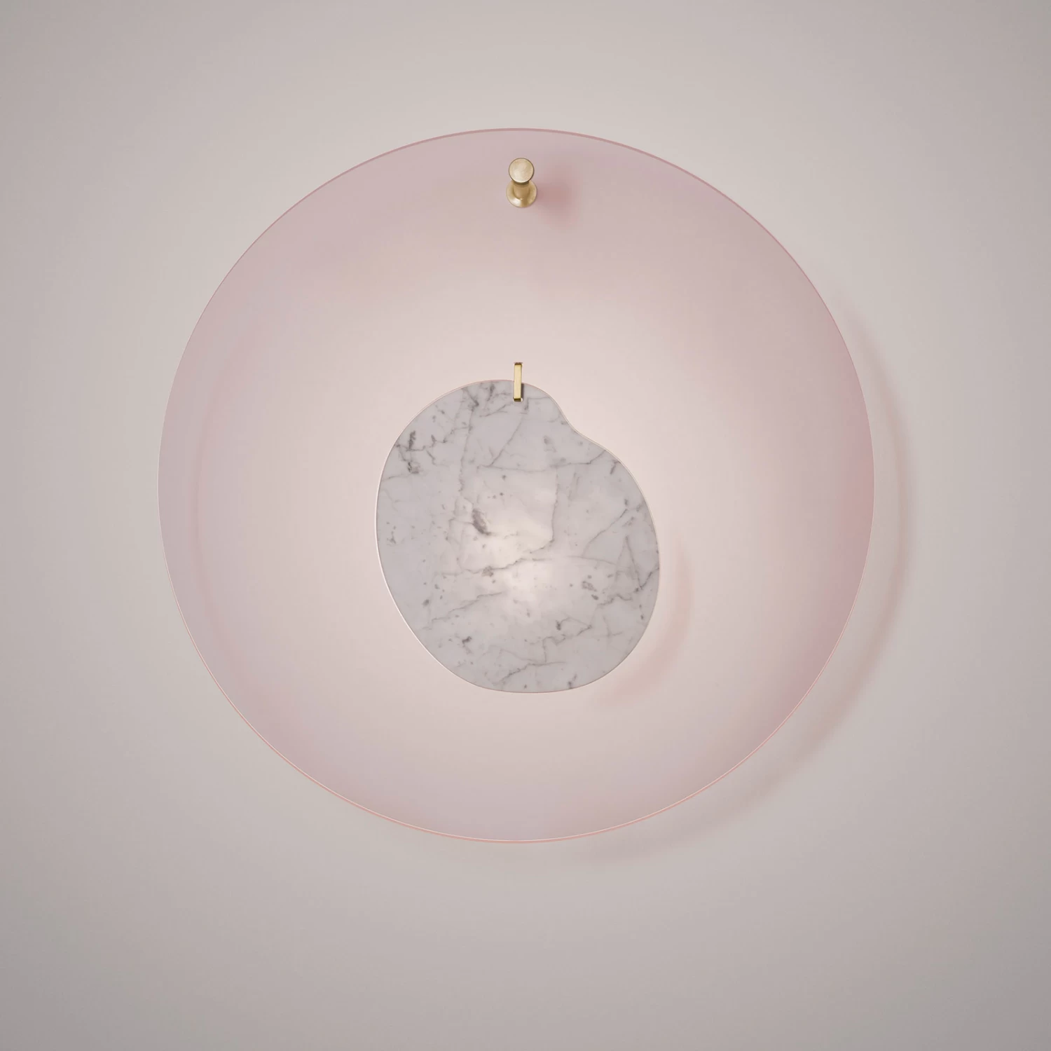 „Gioia ist ein Schmuckstück für unser Zuhause“, sagt der Designer Andrea Anastasio selbst über die von ihm entworfene Wandleuchte (2019). Dabei steht die Transparenz der Scheibe im Kontrast zu der Marmorscheibe und symbolisiert damit die Bewegung zwischen zwei Welten: Der mit hellgrauen Adern verzierte Marmor spiegelt die Vergangenheit mit beeindruckenden, architektonischen Gebäuden und Statuen wieder, und die durchscheinende Scheibe aus Perspex die Gegenwart mit Innovationen und synthetischen Materialien.