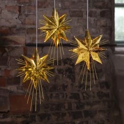 Der sehr ästhetisch gearbeitete Metallstern Mini wirkt mit dem ausgestanzten Lochmuster, durch das das Licht des eingesetzten Leuchtmittels hindurchdringt und das goldfarbene Metall noch stärker glänzen lässt, sehr attraktiv. Ein Dekorartikel für die Advents- und Weihnachtszeit, der frei im Raum schon seine glanzvolle Wirkung entfaltet, als Fensterdekoration offenbart sich jedoch seine volle Schönheit. Mit E14-Fassung ausgestattet. Ein passendes Leuchtmittel ist unter Zubehör separat erhältlich.