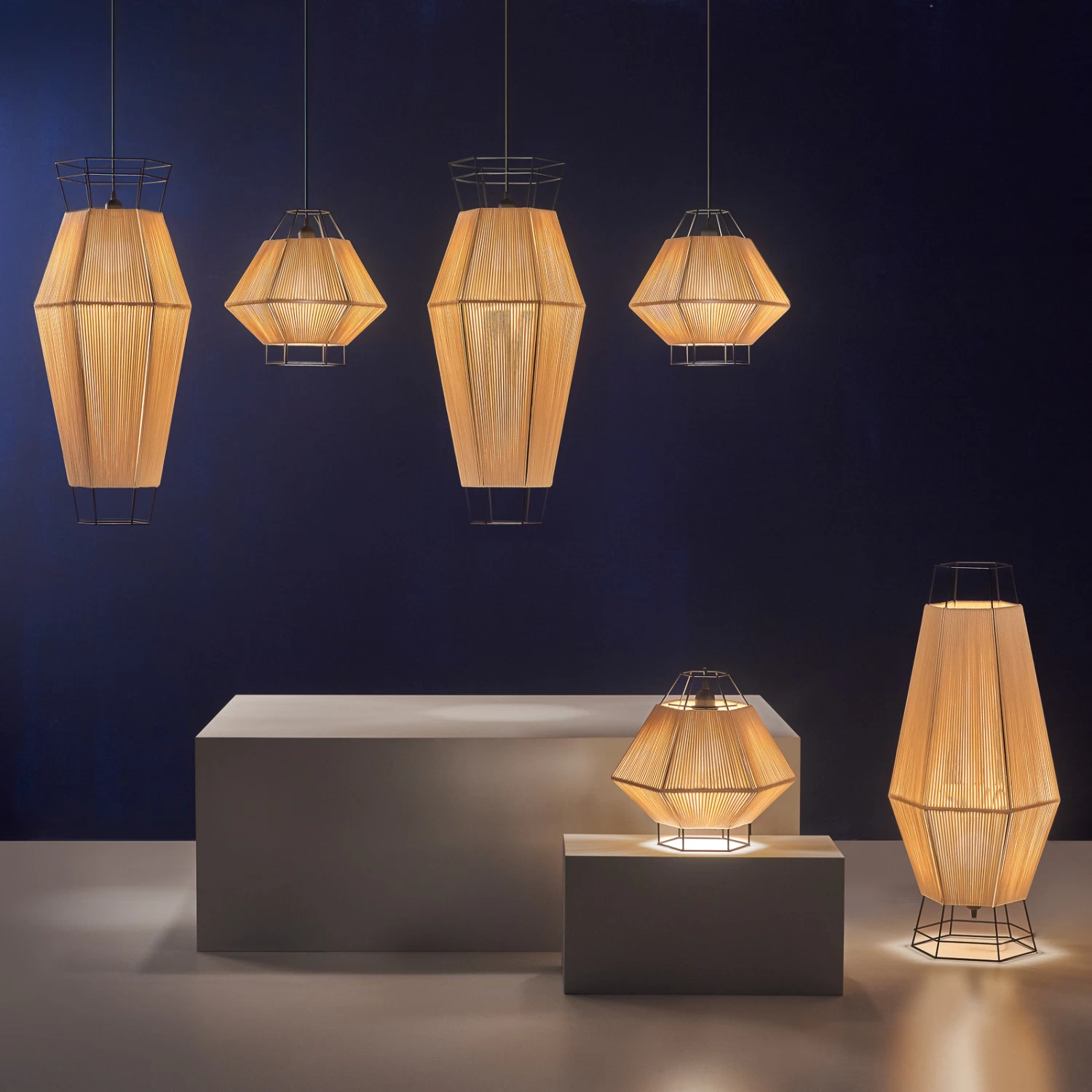 Die Hängeleuchte Legato vereint eine aufregende Käfigleuchte mit gediegenem Cord. Von der schwarzen Deckenbefestigung aus Metall seilt sich das Gestell inklusive der Fassung ab. Umhüllt wird das sechseckige Gerüst von geripptem, festem Baumwollmaterial in dezenten Farbtönen. Diese unaufdringliche Farbkombination harmoniert sehr gut mit kräftigen Farbkonzepten.