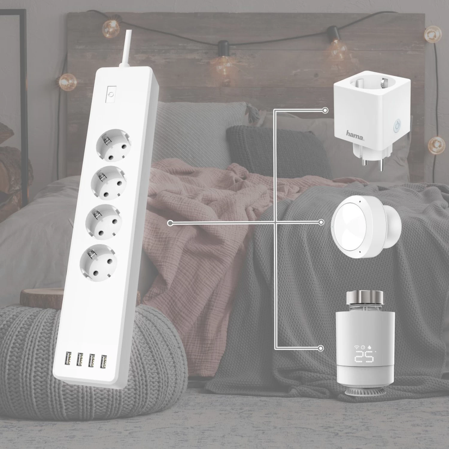 Bis zu vier Leuchten und andere Geräte mit Stecker lassen sich über die Hama WLAN-Steckdosenleiste smart steuern. Jede der vier Steckdosen kann individuell geschaltet werden. Dies ist per WLAN mit der kostenfreien Hama Smart Home App oder mit Sprachbefehlen möglich. Eine Bridge wird hierfür nicht benötigt und das System ist mit dem Google Assistant, Amazon Alexa sowie den Siri (Shortcuts) von Apple kompatibel.