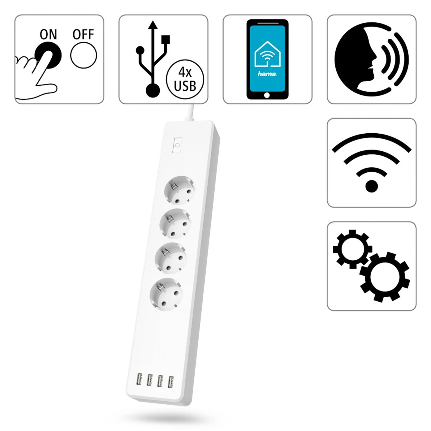 Hama WLAN-Steckdosenleiste mit 4 separat steuerbaren Anschlüssen sowie 4 USB-Anschlüssen, Überlastschutz