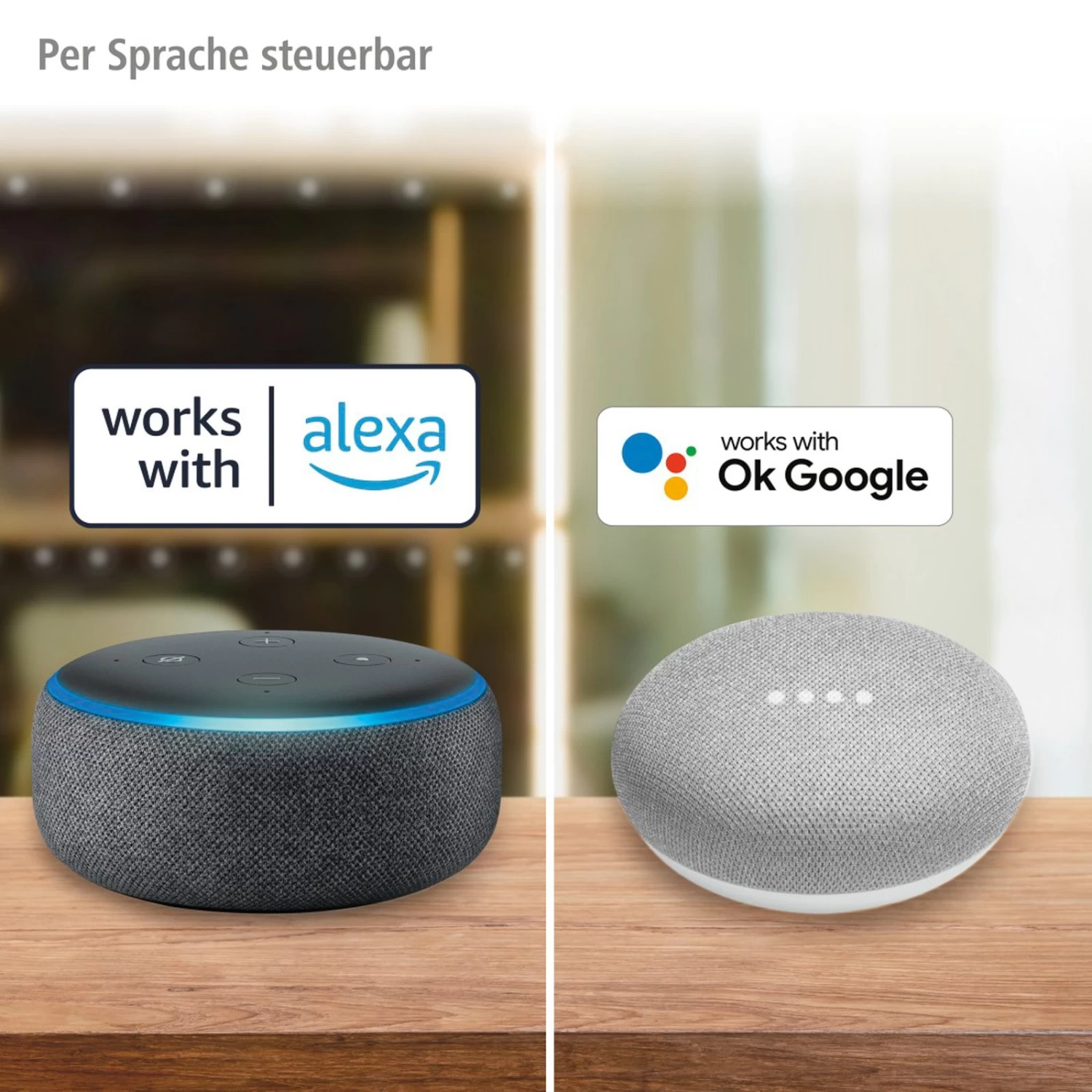 – Sprachsteuerung mit Amazon Alexa, Google Assistant und Apple Siri (Shortcuts) möglich