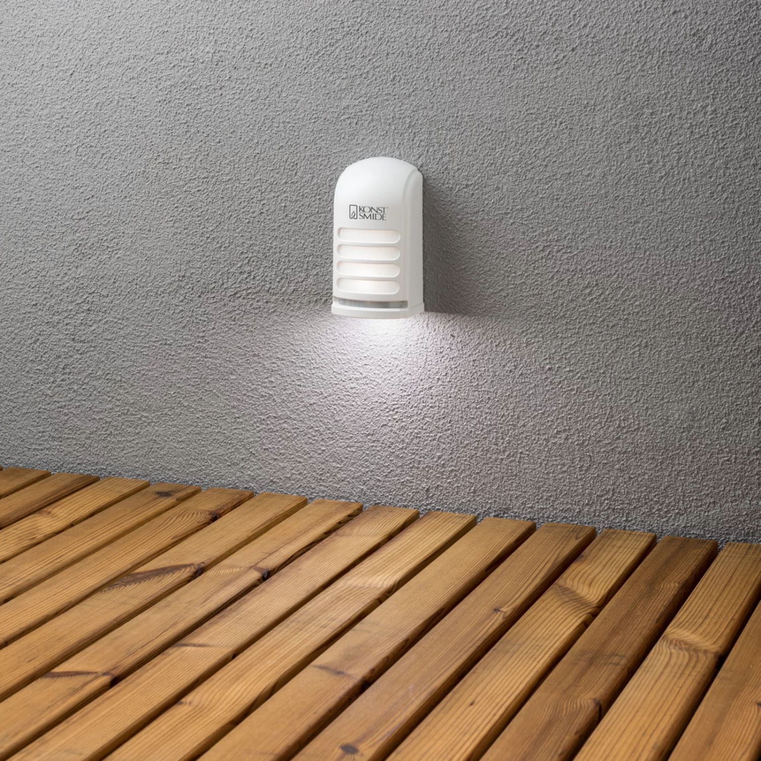 Die aus Kunststoff gefertigte Wandaufbauleuchte Prato mit integriertem Bewegungsmelder ist das perfekte Produkt, um beispielsweise den Hof oder die Terrasse zu beleuchten. Durch den Sensor schaltet sich die Leuchte nur an, wenn eine Bewegung erfasst wird und er schont so die Leistung der Batterien, welche die Leuchte betreiben. Die Reichweite des Lichts dehnt sich auf bis zu 4 m aus und der Sensor kann Bewegungen in einem Winkel von bis zu 160° erfassen. Außerdem spendet das LED-Licht je nach Einstellung für die Dauer von 3 Sekunden bis 5 Minuten Licht. Dieser wird in der Dunkelheit für eine ausreichende Ausleuchtung des gewählten Bereiches sorgen. Anhand der Schutzart IP54 kann man erkennen, dass dieses Produkt sehr gut gegen Witterungsbedingungen geschützt ist. Optisch ist die Leuchte in Weiß gehalten, rechteckig geformt und besitzt vier waagerechte Lichtaustritte auf der Vorderseite. Hergestellt ist Prato aus Kunststoff.