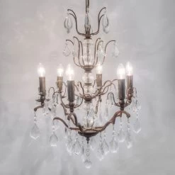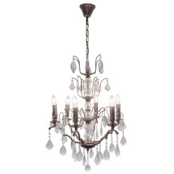 Ein antik eingerichteter Raum lässt sich mit dem sechsflammigen Kronleuchter Cristallo stilgerecht und festlich beleuchten. Das Gestell besteht aus Eisen in Antikbraun-Gold und besticht mit antikem Charme. Der Behang aus dekorativ geformten, klaren Kristallen funkelt geheimnisvoll im abstrahlenden Licht. Als Lichtquellen eignen sich Kerzenlampen aller Energieeffizienzklassen. Es können auch energiesparende LED-Leuchtmittel mit geeignetem Sockel verwendet werden.