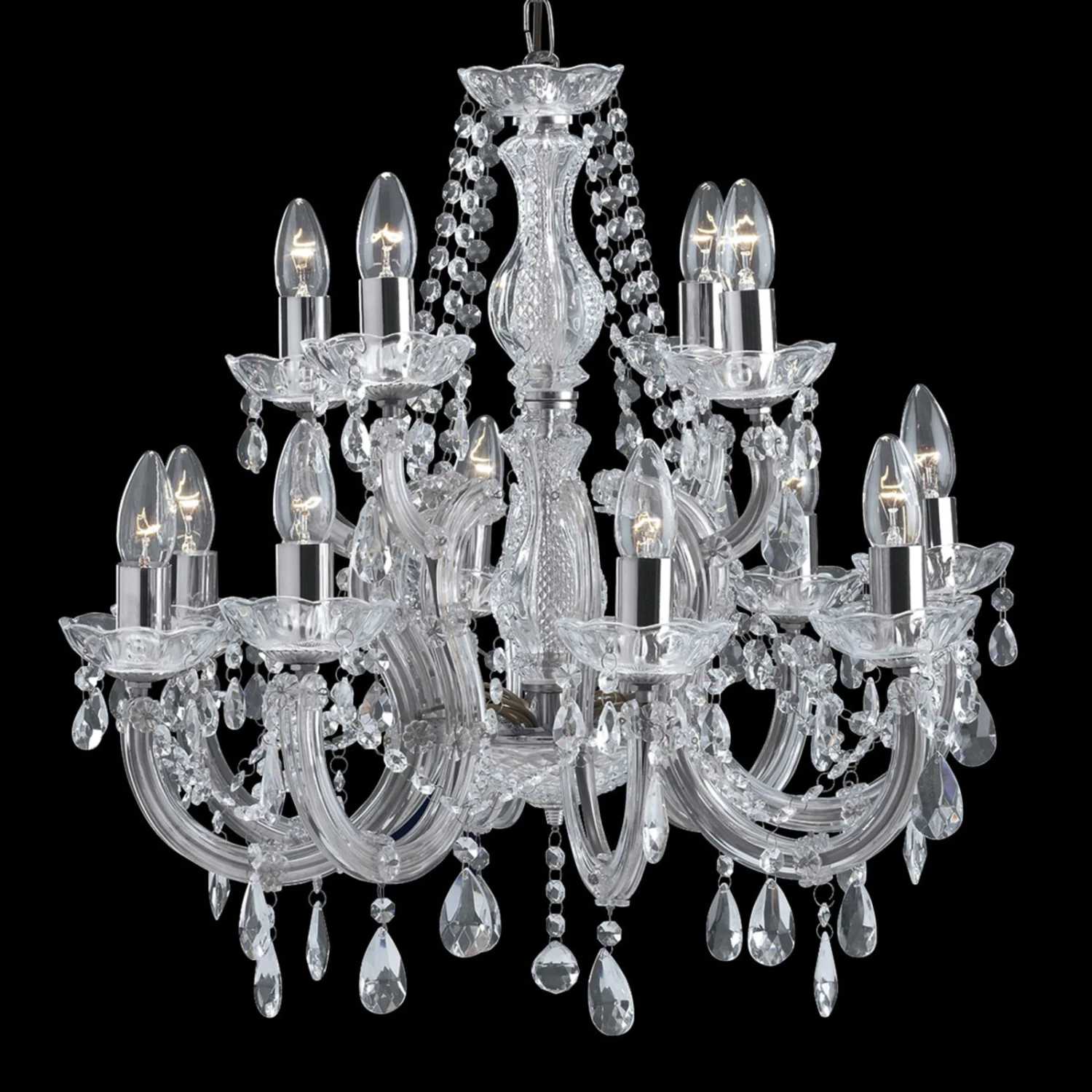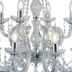 Fast gänzlich aus Acrylglas gefertigt ist der imposante Kronleuchter MARIE THERESE. Ein üppiger Behang aus geschliffenen Glaskristallen verziert das formschön gestaltete Gestell des Kronleuchters, der mit seinen 12 Kerzen für eine helle und gleichmäßige Ausleuchtung sorgt. Ergänzt wird das glanzvolle Gesamtbild durch einzelne dezente Elemente in Chromoptik, die den Kronleuchter zum Strahlen und Glänzen bringen.