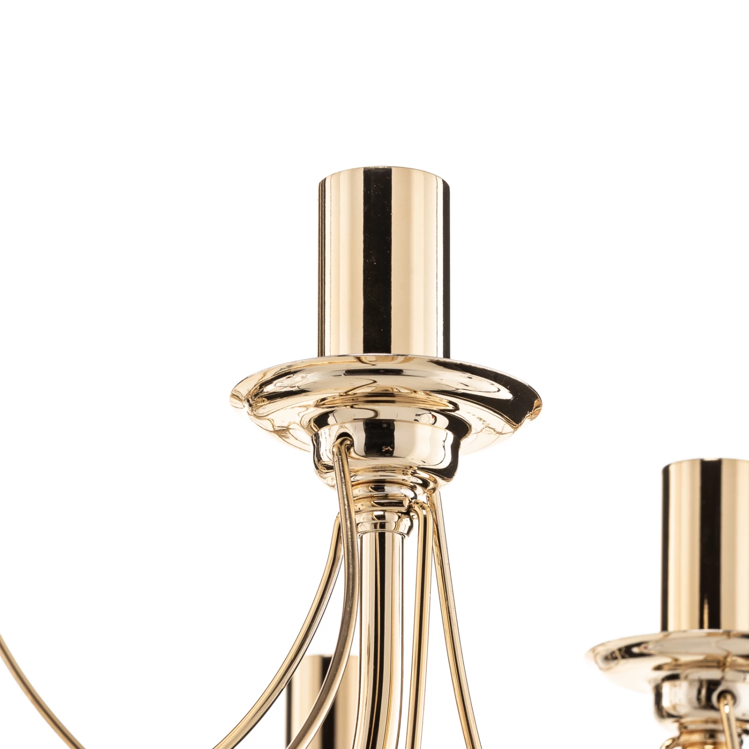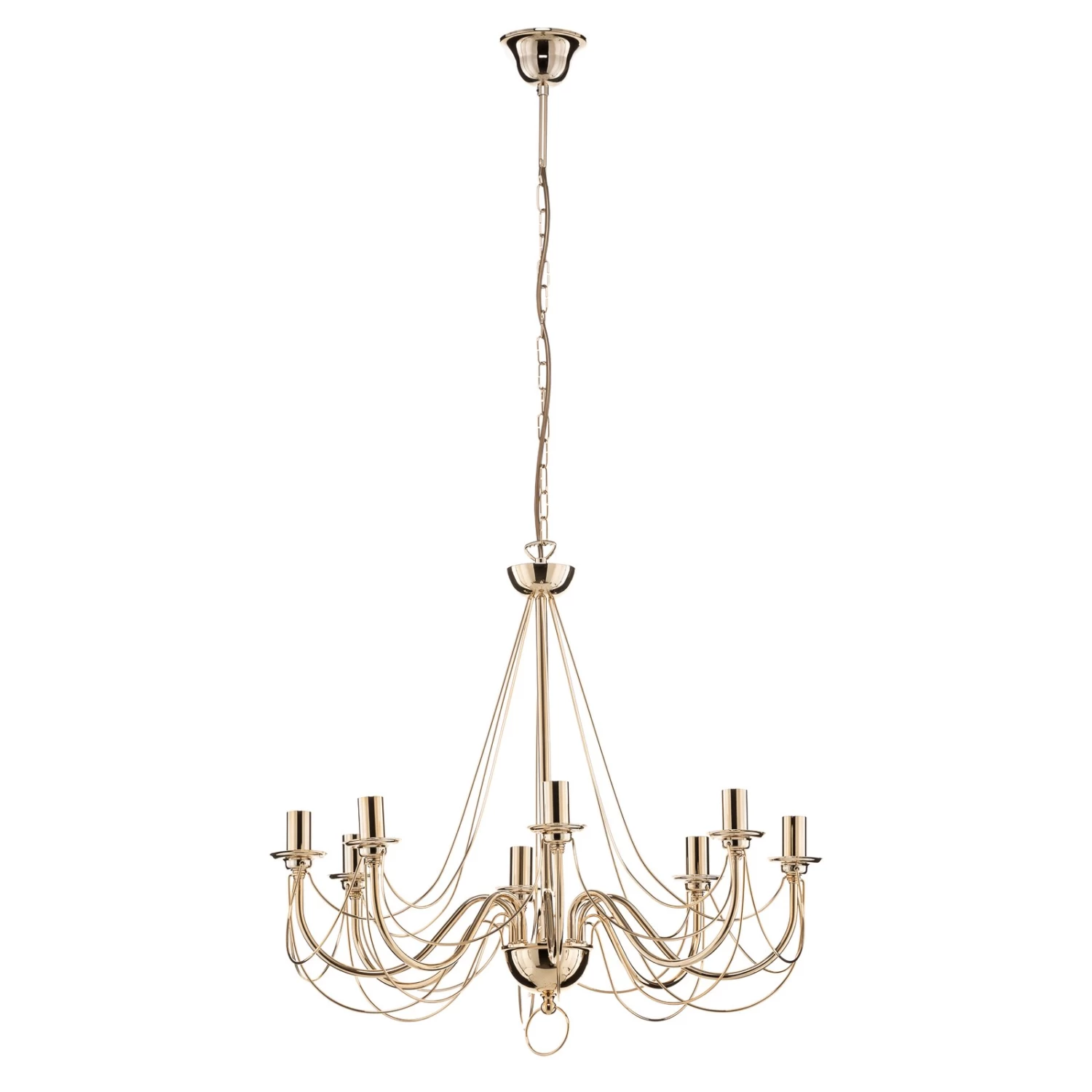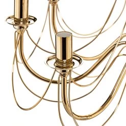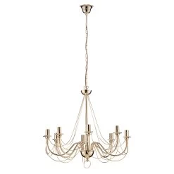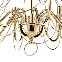 Prunkvoll und formschön ist der Kronleuchter Retro dargestellt. Die geschwungenen Metallarme lassen ihn klassisch erscheinen, während das glänzende Goldfinish ihm eine gewisse Luxuriösität einhaucht. Insgesamt acht Leuchtmittel, die über das Zubehör direkt mitbestellt werden können, finden hier ihren Platz. Das sorgt für eine ausreichende Helligkeit im Wohnraum.