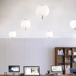 Die Deckenleuchte Kushi überzeugt mit weichen, natürlichen Rundungen, die in ihrer Gesamterscheinung der Form eines Apfels nachempfunden sind. Der aus mundgeblasenem Glas bestehende Schirm ist opal und zweischichtig gearbeitet. Er wird mittig von einem zierlichen, farblich abgesetzten Metallstiel durchdrungen, der leicht in den Raum hineinragt. Bei Kushi treffen verschiedene Formen und Farben aufeinander, die harmonisch miteinander agieren und ein Gefühl von Leichtigkeit im Raum verteilen. Das diffuse Licht, das in den Raum gestrahlt wird, erhellt die Umgebung und macht Kushi zu einem eleganten und zeitlosen Beleuchtungsobjekt für zahlreiche Wohnräume und Stile.