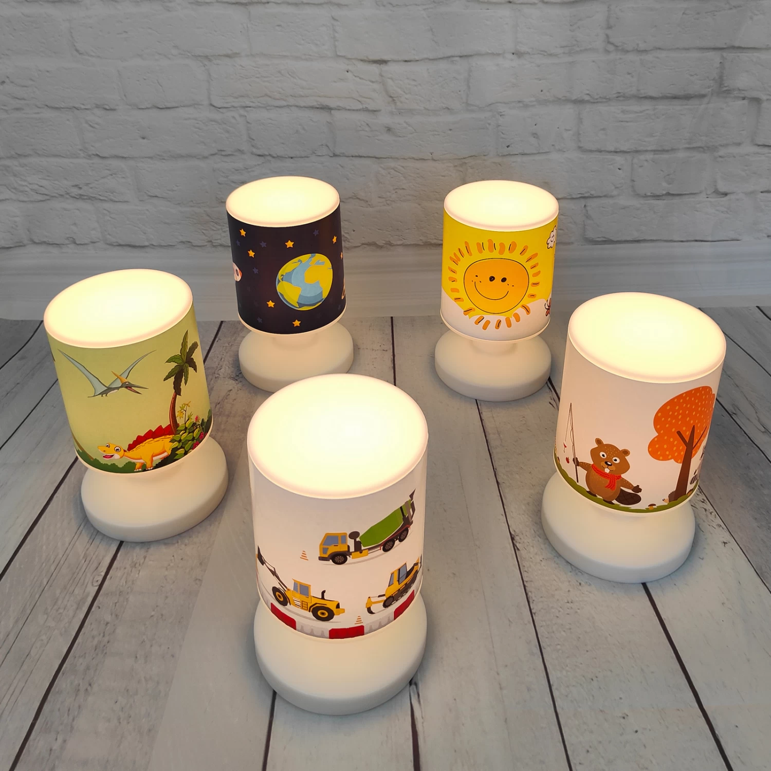 Die LED-Akku-Tischleuchte Baustelle präsentiert auf ihrem weißen Schirm verschiedene Baustellenfahrzeuge sowie andere passende Symbole in unterschiedlichen Farben. Sie ist mit einem Akku ausgestattet und ein USB-Kabel zum Aufladen ist im Lieferumfang enthalten. Da sie über die Schutzart IP44 verfügt (Spritzwasserschutz), kann sie auch im geschützten Außenbereich verwendet werden. Ein warmweiß leuchtendes LED-Modul ist integriert.
