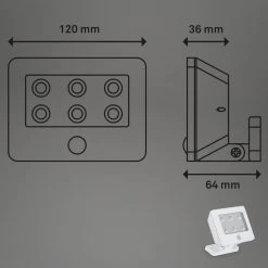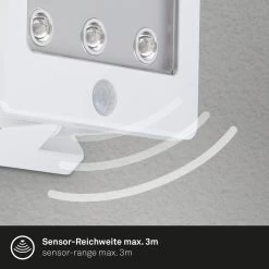 Diese kleine, um 60 Grad nach unten schwenkbare Außenleuchte mit Bewegungssensor nach Schutzart IP54 ist vor Regen geschützt und ideal für Einfahrten, Garagen, Hauseingänge, Terrassen und Gärten. Der Bewegungssensor hat einen Erfassungsbereich von 3 Metern und einen Erfassungswinkel von 80-100 Grad. Wenn die Wandlampe eine Bewegung erkennt, schaltet sie sich für 45 Sekunden ein. 6 AAA-Batterien versorgen die LED-Wandleuchte im Außenbereich. Diese sind, ebenso wie das Befestigungsmaterial, im Lieferumfang enthalten. Wenn in der Dunkelheit eine Bewegung wahrgenommen wird, schaltet sie sich dank eines Lichtsensors ein. Es kann auch ein Dauerlicht für den ganzen Tag eingestellt werden. Das Licht ist 6.500 Kelvin kaltweiß.