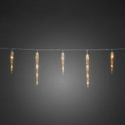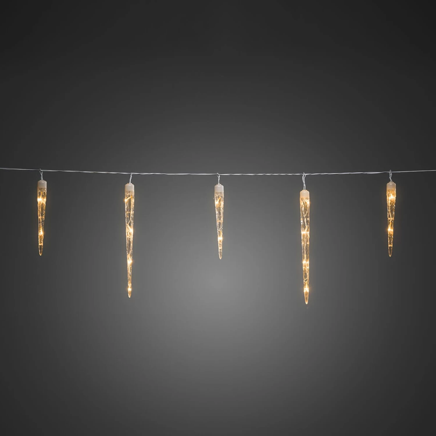 Diese fantastische LED-Lichterkette passt optimal in die kalte Jahreszeit, denn sie ist abwechselnd mit kürzeren und längeren Kunststoffeiszapfen bestückt. In den Eiszapfen ist eine Vielzahl von LEDs verbaut, die stimmungsvolles Licht in der Lichtfarbe Bernstein abstrahlen. An dieser winterlichen Außenbereichs-Lichterkette, die ihr angenehmes Licht weit in die dunkle Nacht schickt, erfreuen sich Hausbewohner und Passanten gleichermaßen. Mit Außentransformator bestückt. Das Kabel ist weiß.