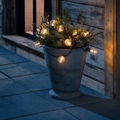 Mit dieser LED-Lichterkette mit den attraktiven Leuchtmitteln in Glühfadenoptik lassen sich überall im Außenbereich stimmungsvolle Dekoideen umsetzen. Besonders auffällig wirkt der gemütliche Charakter der Lichtabstrahlung der bernsteinfarben leuchtenden LEDs. Ein Netzanschluss in der Nähe ist nicht erforderlich, da die LED-Lichterkette mit Batterien bestückt wird: 4 x AA (nicht inklusive – über Zubehör erhältlich). Mit integriertem 6-Stunden-Timer.
