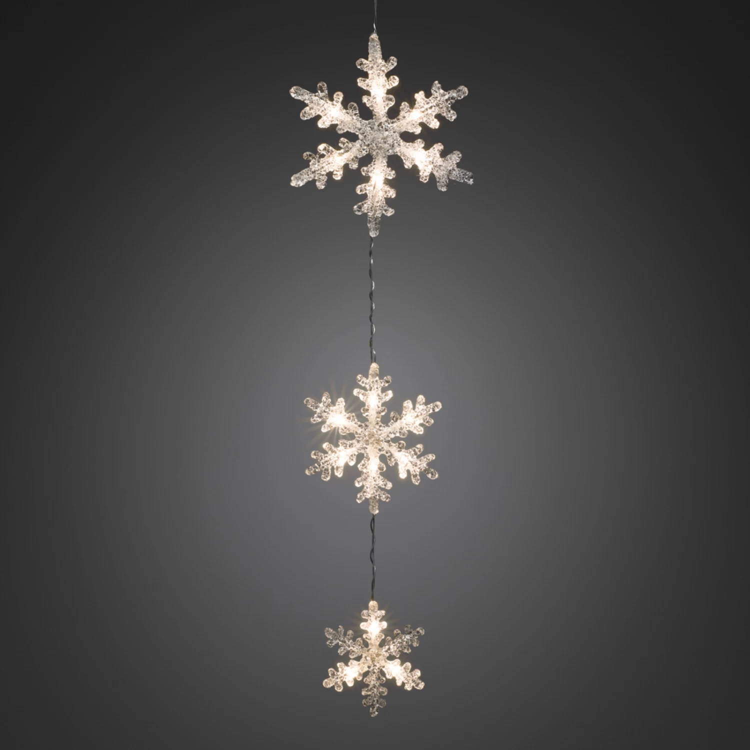 Von 15 warmweiß strahlenden LEDs wird diese schöne LED-Lichterkette Schneeflocken mit sanftem Licht erhellt und verleiht so jedem Raum – ob als Fensterdekoration oder als Wandschmuck angebracht – eine weihnachtliche Note. Die einzelnen Schneeflocken haben einen Durchmesser von 13 cm, 17 cm und 21 cm. Der benötigte Innentrafo gehört bereits zum Lieferumfang. Mit transparentem, 500 cm langem Zuleitungskabel bestückt.