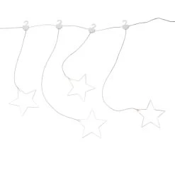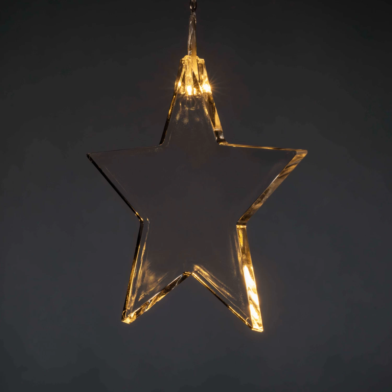Der LED-Lichtervorhang eignet sich für die Nutzung im Innenbereich, beispielsweise vor einem Fenster: Er ist mit acht durchsichtigen Sternen aus Kunststoff bestückt, die unterschiedlich hoch aufgehängt sind. Die Sterne werden durch warmweiße LEDs illuminiert.