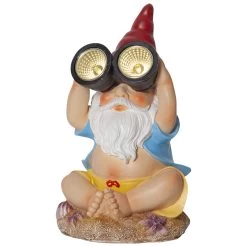 Gnomy ist ein Gartenzwerg, der im Schneidersitz mit seinem Fernglas in den Himmel schaut. Gnomy zaubert mit seiner lustigen Gestaltung jedem Betrachter ein Lächeln aufs Gesicht. Die LEDs der Dekorationsleuchte sind im Fernglas verbaut und erstrahlen dank integriertem Solarmodul und Dämmerungssensor bei Einbruch der Dunkelheit ganz von alleine. Besonders dekorativ wirkt es, wenn mit mehrere Exemplare von Gnomy oder in Kombination mit sonstiger Außendekoration ein leuchtendes Ensemble zusammengestellt wird.