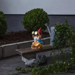 Gnomy ist ein Gartenzwerg, der im Schneidersitz mit seinem Fernglas in den Himmel schaut. Gnomy zaubert mit seiner lustigen Gestaltung jedem Betrachter ein Lächeln aufs Gesicht. Die LEDs der Dekorationsleuchte sind im Fernglas verbaut und erstrahlen dank integriertem Solarmodul und Dämmerungssensor bei Einbruch der Dunkelheit ganz von alleine. Besonders dekorativ wirkt es, wenn mit mehrere Exemplare von Gnomy oder in Kombination mit sonstiger Außendekoration ein leuchtendes Ensemble zusammengestellt wird.