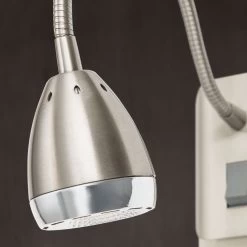 Steckdosenleuchten erweisen sich immer dann als praktisch, wenn bereits eine Steckdose an gewünschtem Ort, z. B. neben dem Bett auf Kopfhöhe, vorhanden ist und man sich eine kabellose Beleuchtung wünscht. Einmal eingesteckt, hat man bei der LED-Steckdosenleuchte Manvel die Möglichkeit, sie über den Kippschalter am Gehäuse ein- und auszuschalten und ihren Lichtkegel mit Hilfe des Schwanenhalses in die gewünschte Richtung zu lenken, damit man lesen oder andere wichtige Sehaufgaben verrichten kann. Optisch punktet Manvel mit einem nickel-satinierten Korpus, der am Ende des Leuchtenkopfs mit einem nickel-glänzenden Ring versehen ist.