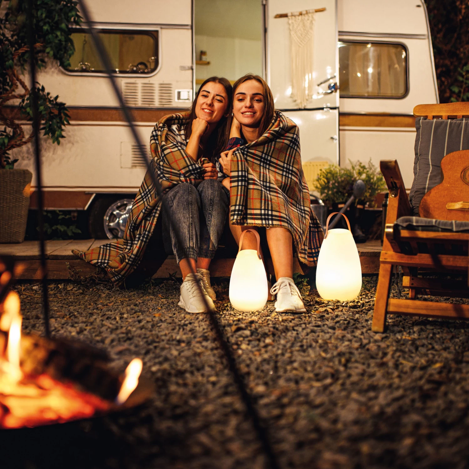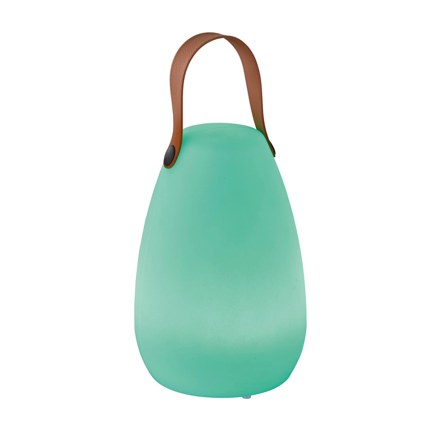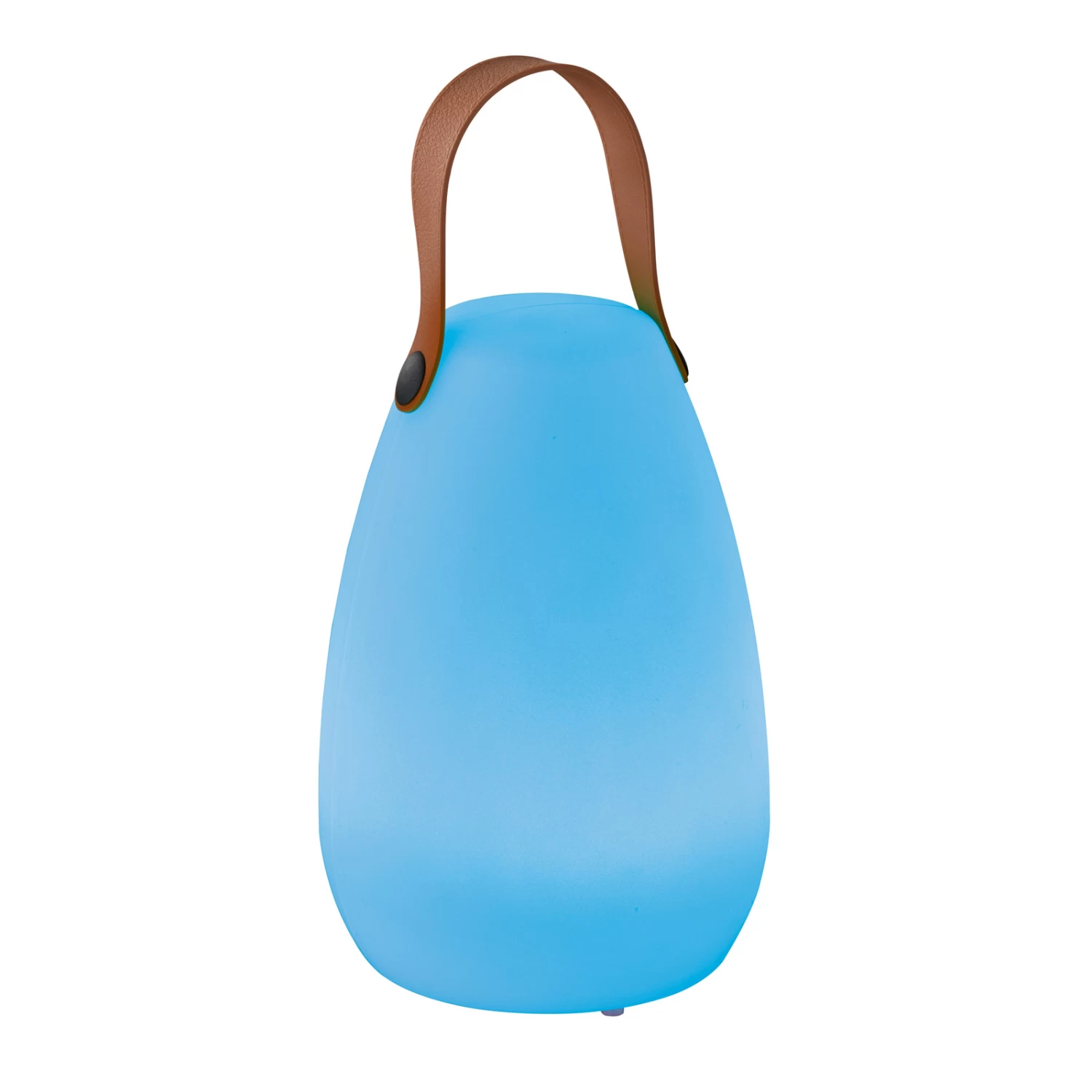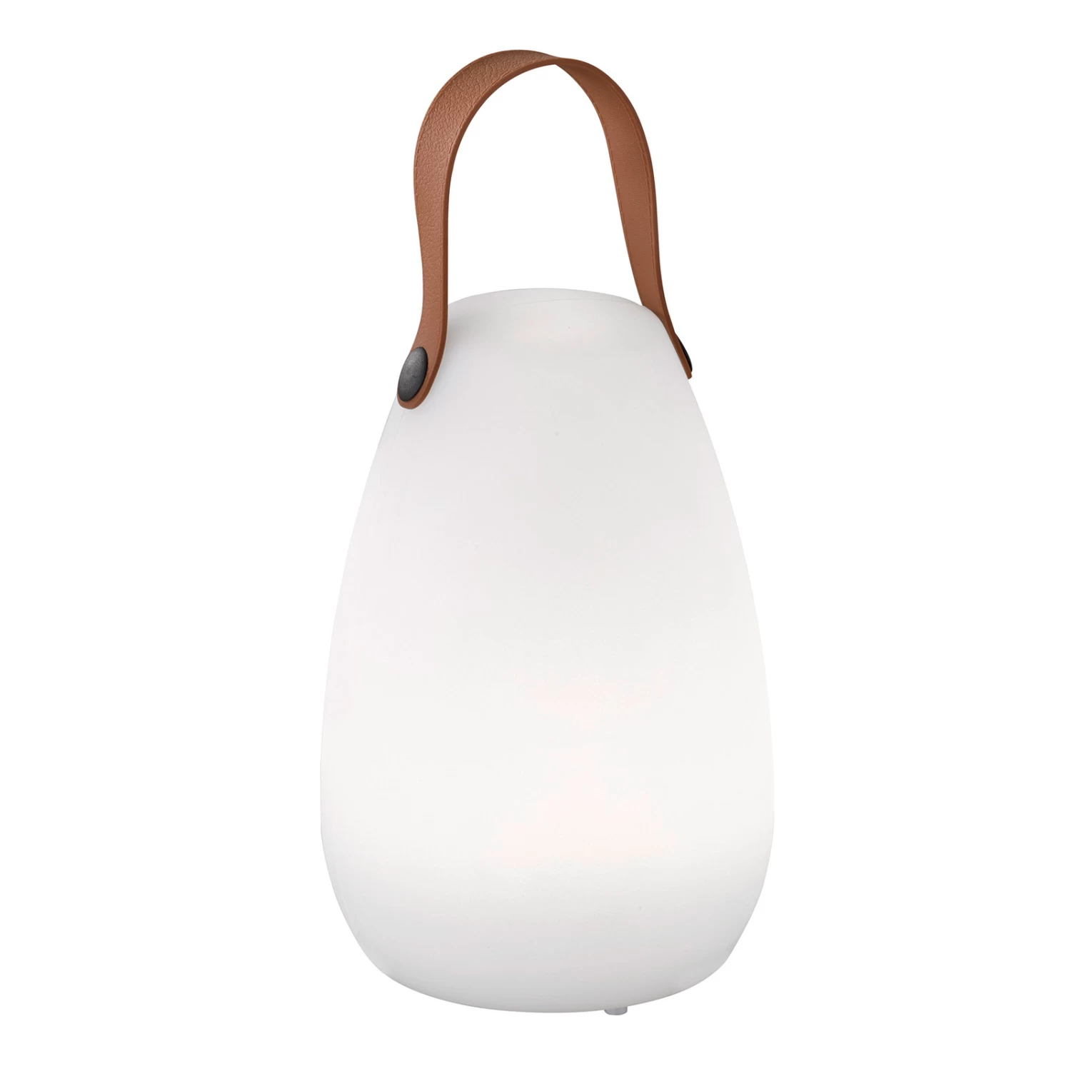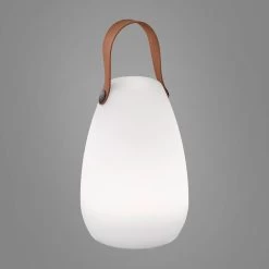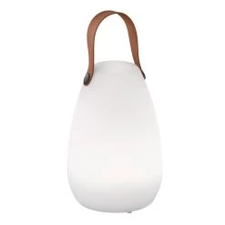 Die LED-Tischleuchte Ruby besteht aus weißem Kunststoff und einem braunen Trageriemen, der an der Oberseite der Leuchte befestigt ist. Durch Schutzart IP44 ist Ruby ein idealer Begleiter für Ausflüge im Freien oder eine schöne Ergänzung für den Balkon, die Terrasse oder den Garten. Die Leuchte verfügt über einen integrierten Akku, der mit dem beigelegten Kabel im trockenen Innenbereich aufgeladen werden kann. Mit der mitgelieferten Fernbedienung können die praktischen Funktionen der Leuchte gesteuert werden: Ruby verfügt über eine 3-Stufen-Dimmfunktion sowie eine RGB-Farbwechsel-Funktion.
