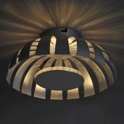 Der halbrunde Schirm der LED-Wandleuchte Flare ist strahlenförmig unterbrochen, sodass bei eingeschaltetem Licht ein toller Strahleneffekt an der Wand entsteht. Im Zentrum des Schirms ist das Leuchtmittel zur Wand hin angebracht und strahlt lediglich den Lampenschirm und durch die Lücken die Wand an. So entsteht indirektes Licht durch die Reflektion von Lampenschirm und Wand, welches eine wohnliche Atmosphäre schafft. Das Design der Leuchte ist eher neutral und passt so zu vielerlei Einrichtungen. Die Leuchte kann je nach Wunsch auch an der Decke angebracht werden.