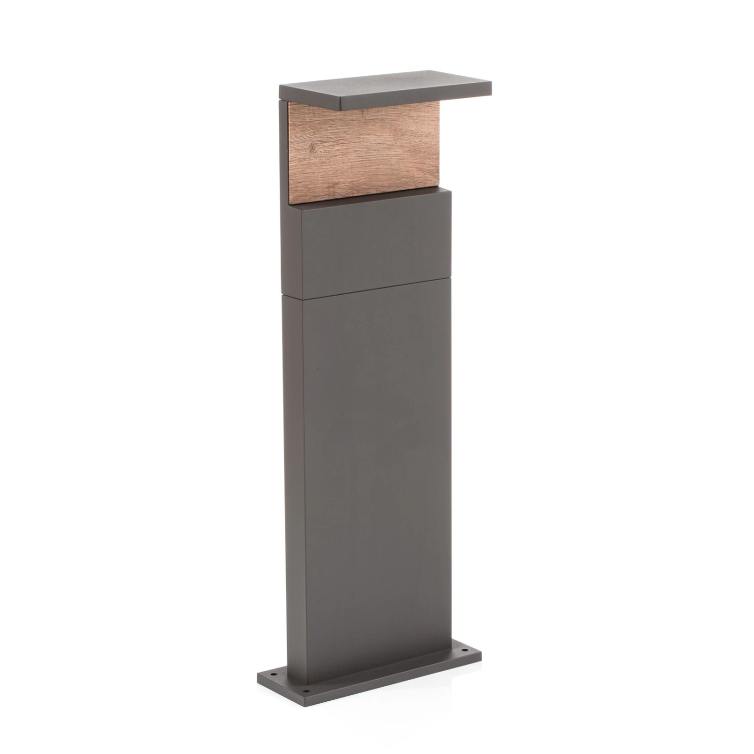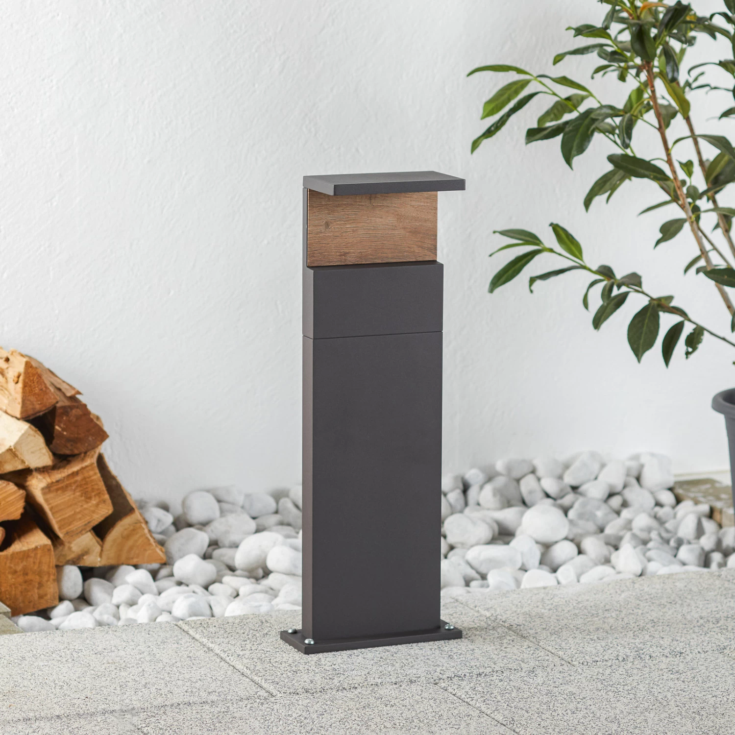 Die LED-Wegeleuchte Ruka besteht aus einem schmalen Aluminium-Gestell, das mit einem flachen Leuchtkopf abschließt. An der Unterseite des Leuchtkopfs sind die LEDs angebracht, sodass der Lichtstrahl hauptsächlich auf den Boden gerichtet ist. Zusätzlich wird das edle Holz-Element angeleuchtet und rückt somit in den Fokus des Betrachters. Das warmweiße Licht kombiniert mit dem Holz erzeugt ein angenehm gemütliches Ambiente. Die Leuchte kann im Terrassen- und Eingangsbereich als Orientierungslicht dienen oder im Garten effektvolle Lichtakzente setzen.