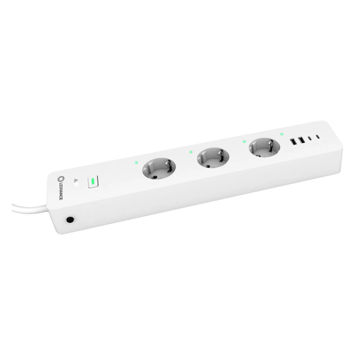 Mit der smarten, dreifachen Steckdosenleiste können verschiedene elektronische Geräte angeschlossen und gesteuert werden. Außerdem verfügt die Leiste über vier USB-Anschlüssen. Die Leiste integriert konventionelle Elektrogeräte in kompatible Smart Home Systeme.
