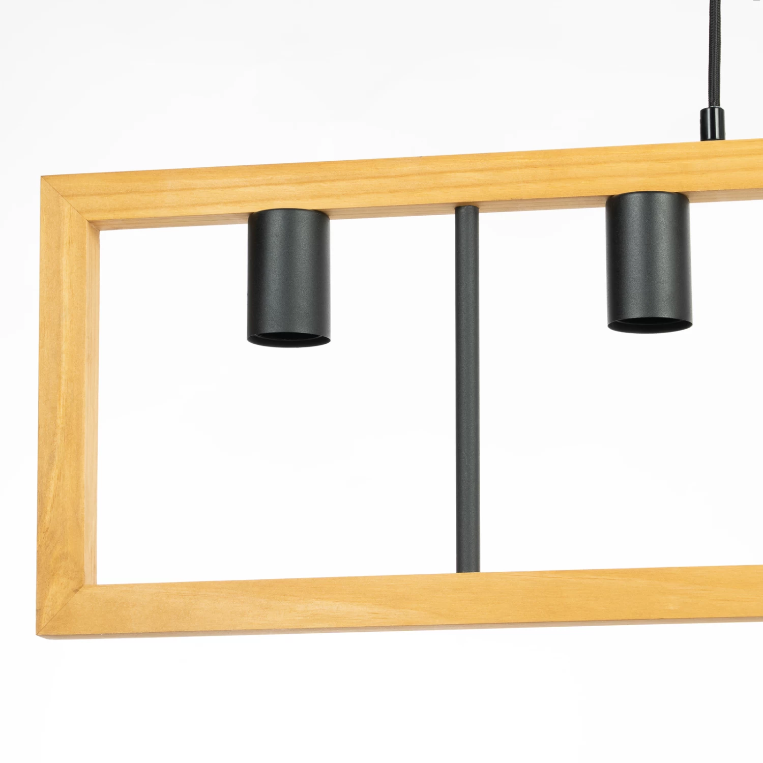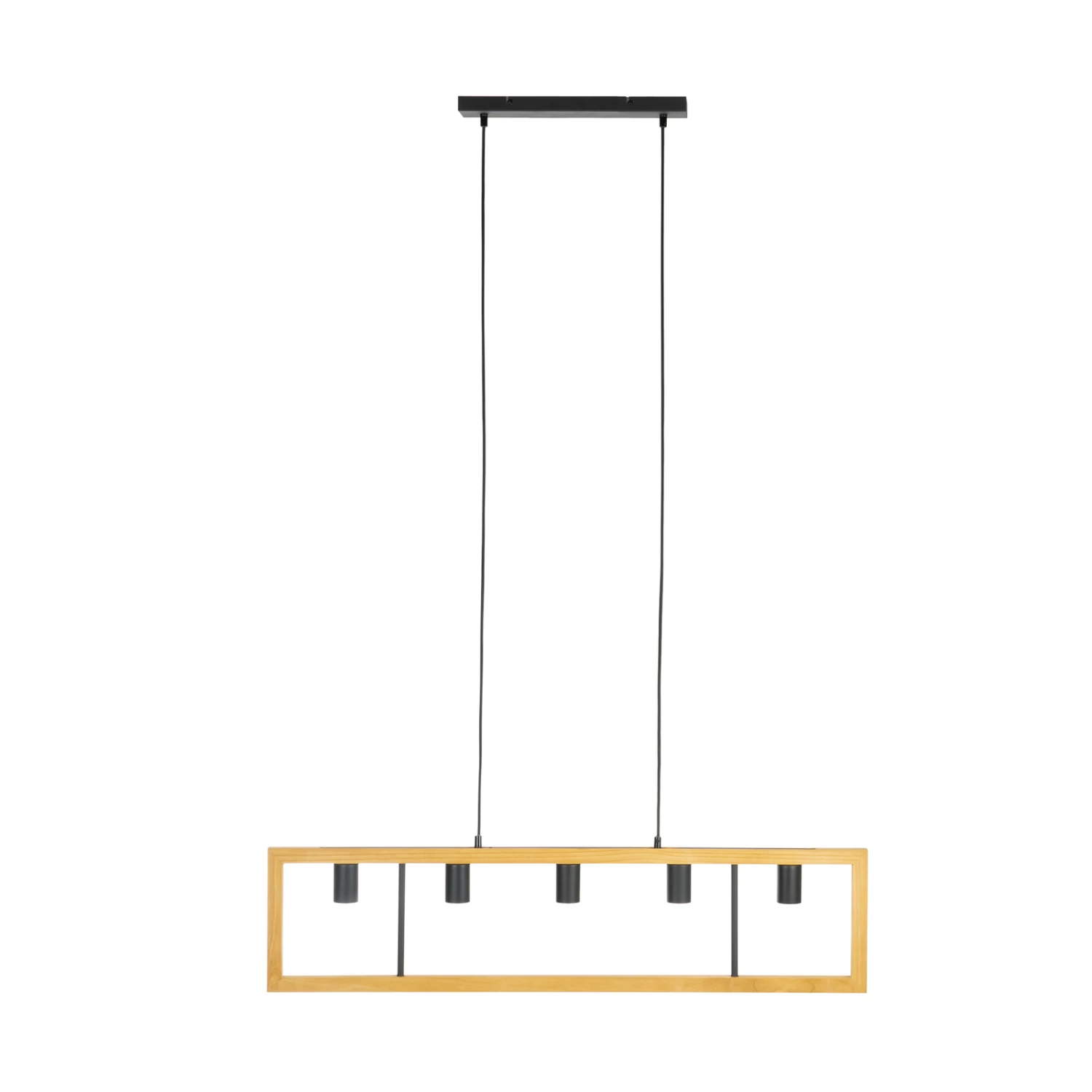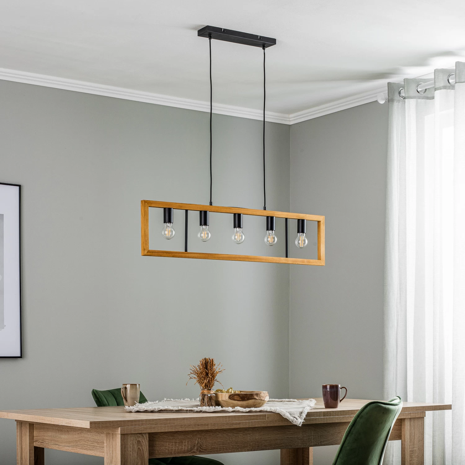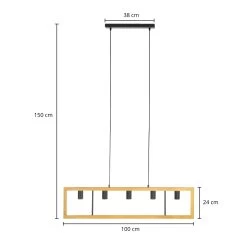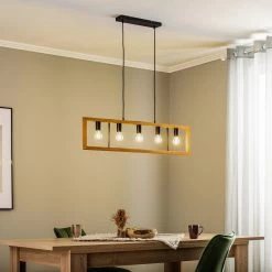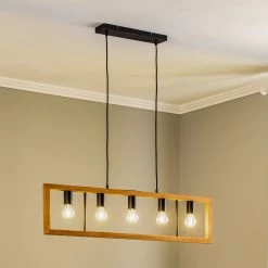 Die Pendellampe Anahita ist die perfekte Begleiterin, wenn es um die Beleuchtung eines Esszimmers geht. Ihr längliches Design passt hervorragend über einen Tisch und sorgt für die richtige Beleuchtung während des Essens. Die Hängeleuchte hängt an zwei schmalen Aufhängungen, welche einen rechteckigen Rahmen aus Kiefernholz tragen, in dessen Mitte fünf Leuchtmittel eingesetzt werden können. Durch die freie Sicht auf die Lichtquellen, empfiehlt es sich hier zu Filament-Leuchtmitteln zu greifen. Die Kombination aus dem hellen Holz und dem dunklen Metall lässt einen attraktiven Farbkontrast entstehen, welcher dem Einrichtungsstil das gewisse Etwas verleiht.