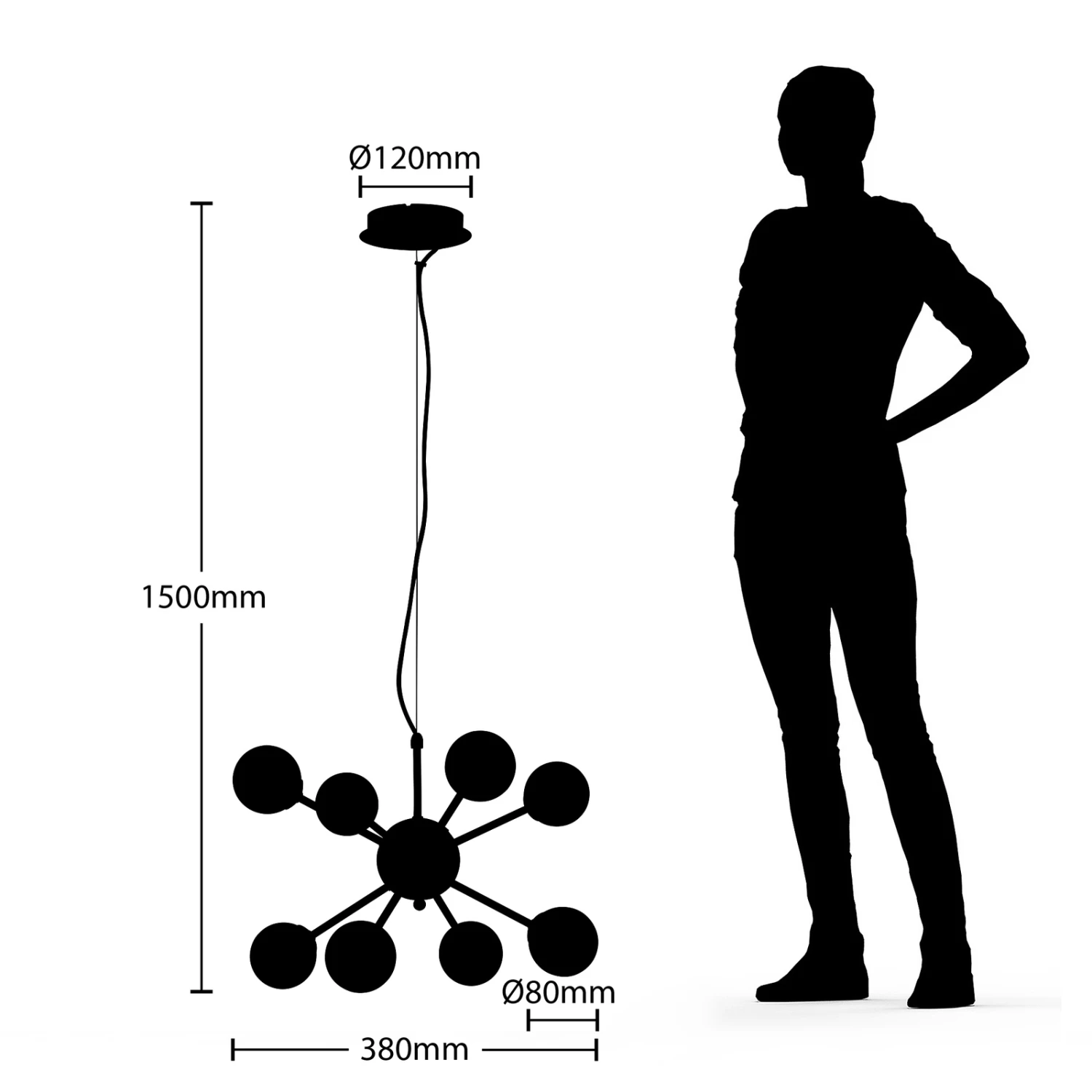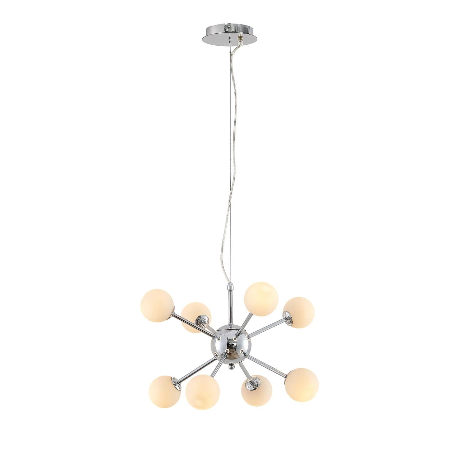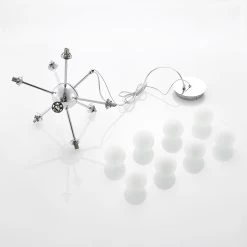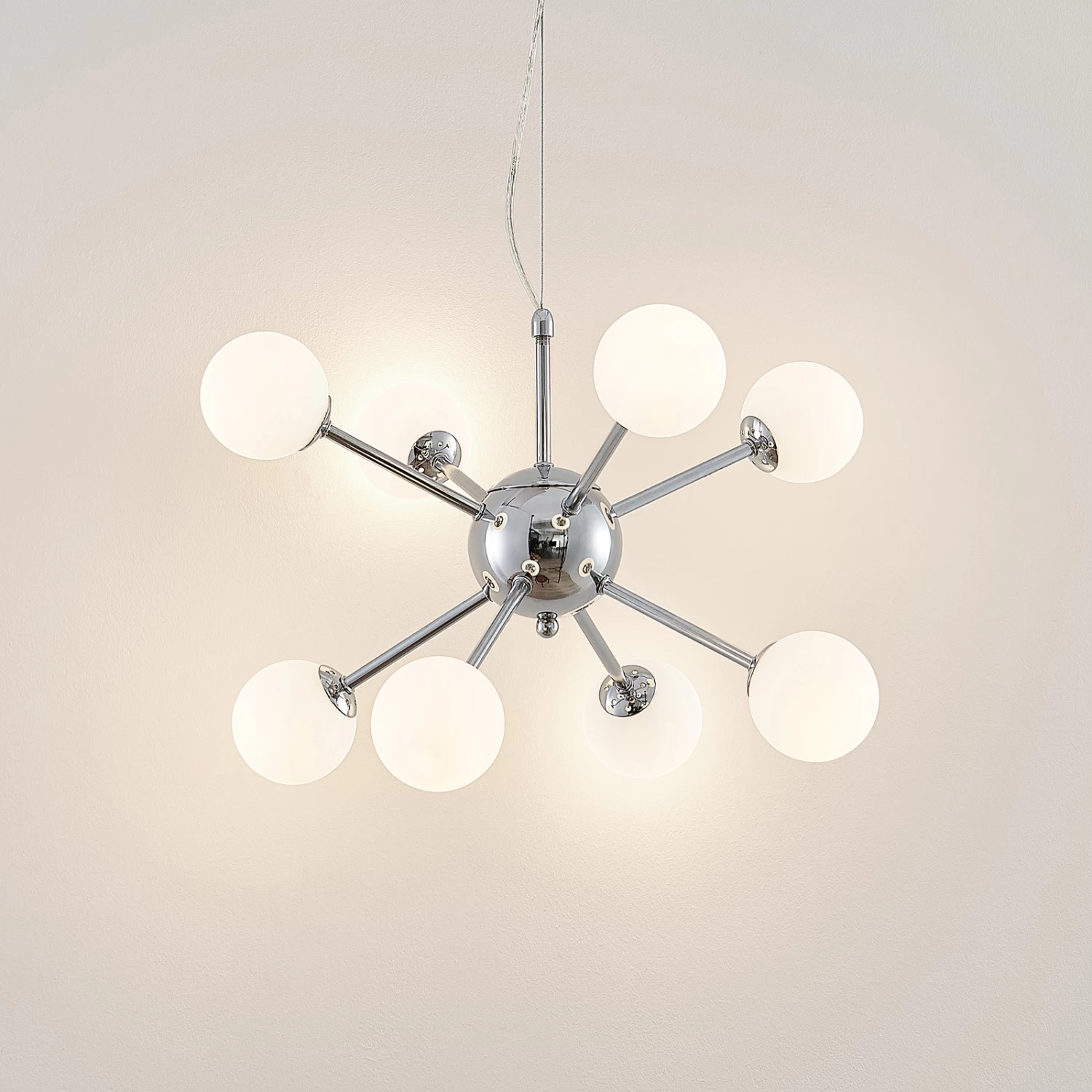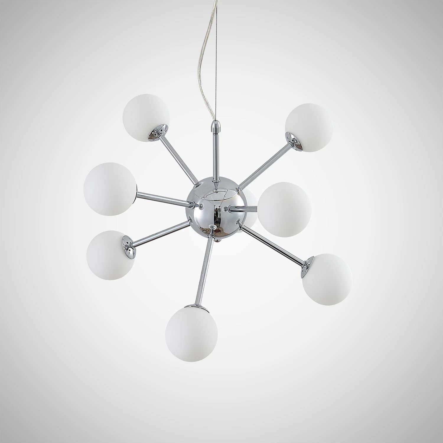 Eine moderne Wohnraumbeleuchtung bietet die Hängeleuchte Chrissy Sie besteht aus einem chromfarbenen Baldachin und Gestell, welches insgesamt acht Leuchtenarme aufweisen kann, die alle an einer in der Mitte befindlichen Kugel angebracht sind. Von dort aus sind sie wie die Strahlen einer Sonne angeordnet und geben ihr Licht zu allen Seiten hin ab. Die kugelförmigen Glasschirme, die jeweils sich je am Ende jeden einzelnen Arms befinden, geben das Licht dabei gleichmäßig und blendfrei ab.