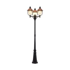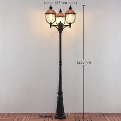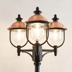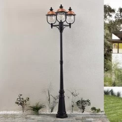 Ein wenig Nostalgie findet sich in den Details des schwarzen Aluminiumgestells wieder, sowie in der Gestaltung der einzelnen, laternenförmigen Lichtquellen. Diese bestehen aus einem transparenten Schirm, der die E27-Fassung sicher umschließt, und einem aus Kupfer bestehenden Dach, welches zusätzlich Schutz vor Wind und Wetter gewährleistet. So ist der seewasserfeste Kandelaber Clint auch für den Einsatz in Meeresnähe geeignet.