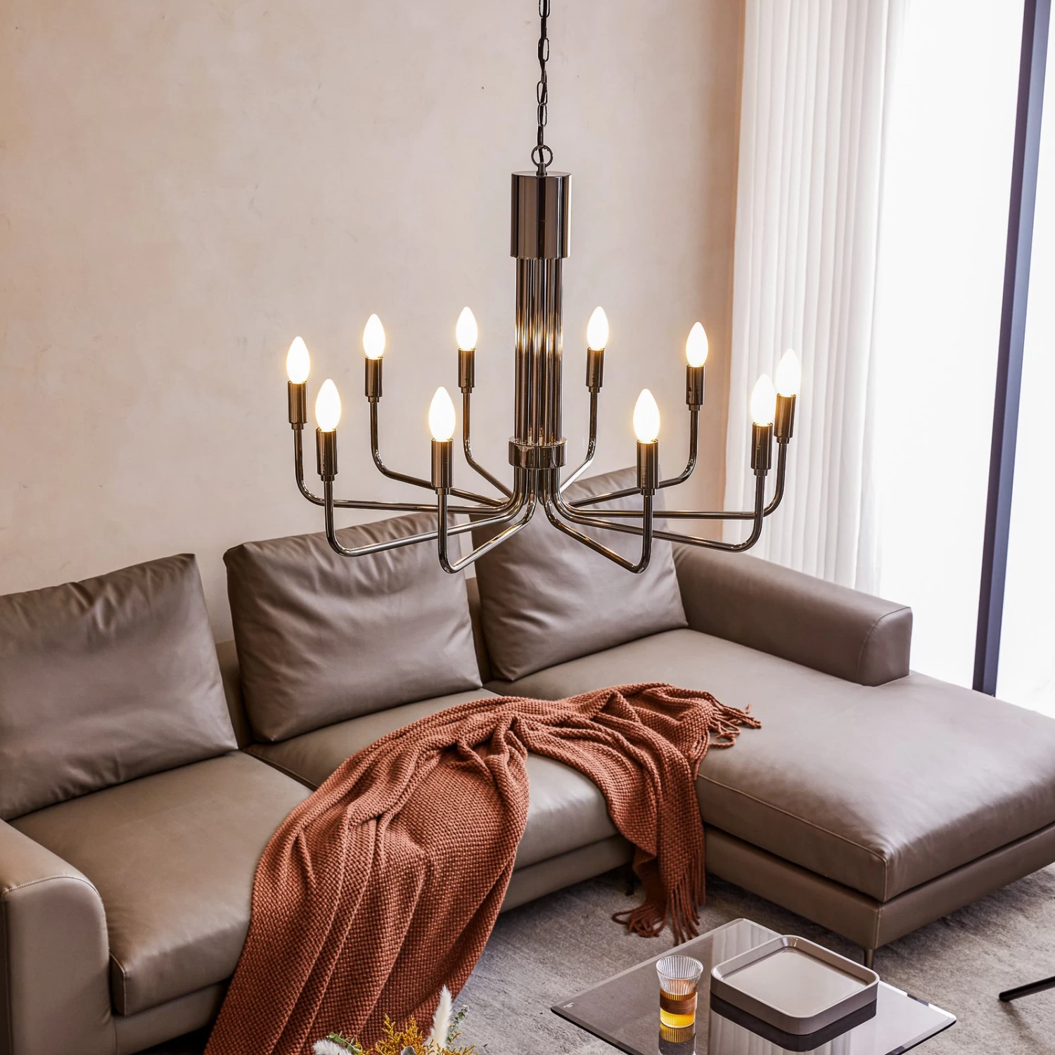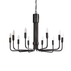 Der Kronleuchter Elanova wurde gänzlich aus Eisen hergestellt und mit einem beeindruckenden Finish in der Gunmetal-Farbe überzogen. Er bietet Platz für insgesamt zehn Leuchtmittel und kann somit auch größere Raumbereiche hervorragend ausleuchten. Im Gegensatz zu einem ganz klassischen Kronleuchter wurde bei diesem Design auf opulente Verzierungen verzichtet und sich ganz auf das Wesentliche konzentriert. Deshalb lässt sich diese besondere Leuchte auch mit moderneren Einrichtungsstilen gut kombinieren.