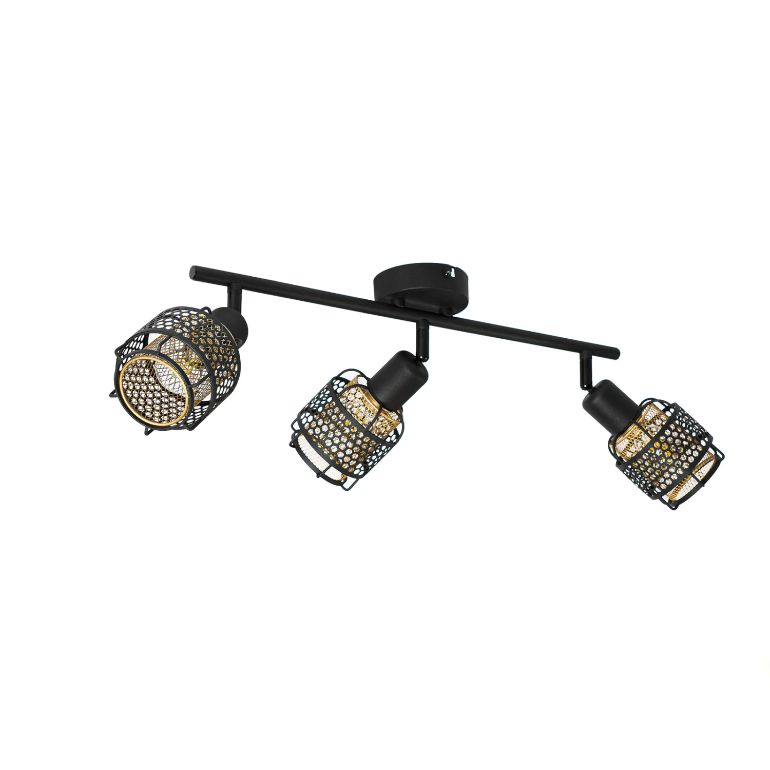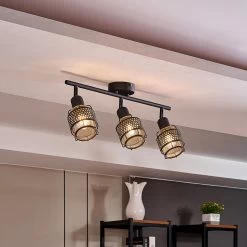 Der aus Eisen hergestellte Deckenspot Eudoria überzeugt mit seinem aufsehenerregenden Aussehen und verleiht der Inneneinrichtung das gewisse Etwas. Er besteht aus einer Strebe, die an einer runden Deckenhalterung angebracht ist und an der drei Leuchtenschirme sitzen. Diese Schirme sind das Besondere Detail des Strahlers. Sie bestehen aus jeweils zwei Schirmen, die ineinander angebracht sind und darüber hinaus ein gestanztes Muster besitzen. Durch dieses Muster entsteht durch das generierte Licht ein spannendes Lichtspiel, dass sich im Raum verbreitet. Der Deckenstrahl Eudoria kann mit E14-Leuchtmitteln bestückt werden.