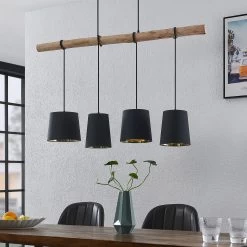 Die Hängeleuchte Hinai besticht mit ihrem besonderen Design und dem interessanten Mix aus unterschiedlichen Materialien. Die vier Leuchtenschirme wurden aus Textil hergestellt und wurden außen in Schwarz und innen in elegantem Gold gestaltet. Die Schirme sind an ihren Textilkabeln um einen Balken aus Eukalyptusholz gewickelt, sodass die Abhängehöhe jederzeit manuell angepasst werden kann. Diese Leuchte kommt wunderbar über einem Esszimmertisch zur Geltung.
