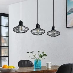 Justinos ist nicht nur eine zuverlässige Hängeleuchte, sondern darüber hinaus ein attraktives Dekorationsstück. Sie besteht aus Eisen, welches in einem stilvollem Mattschwarz gehalten ist. An ihrer länglichen Deckenhalterung sind drei Leuchtenschirme angebracht, welche mit ihrem Aussehen an Käfige erinnern. Die Fassungen, die sich hinter den Streben befinden, können mit entsprechenden Leuchtmitteln bestückt werden, deren Licht durch die Käfige gebrochen wird. Justinos findet innerhalb eines Wohnzimmers ihren perfekten Platz und setzt attraktive Akzente innerhalb der Inneneinrichtung.